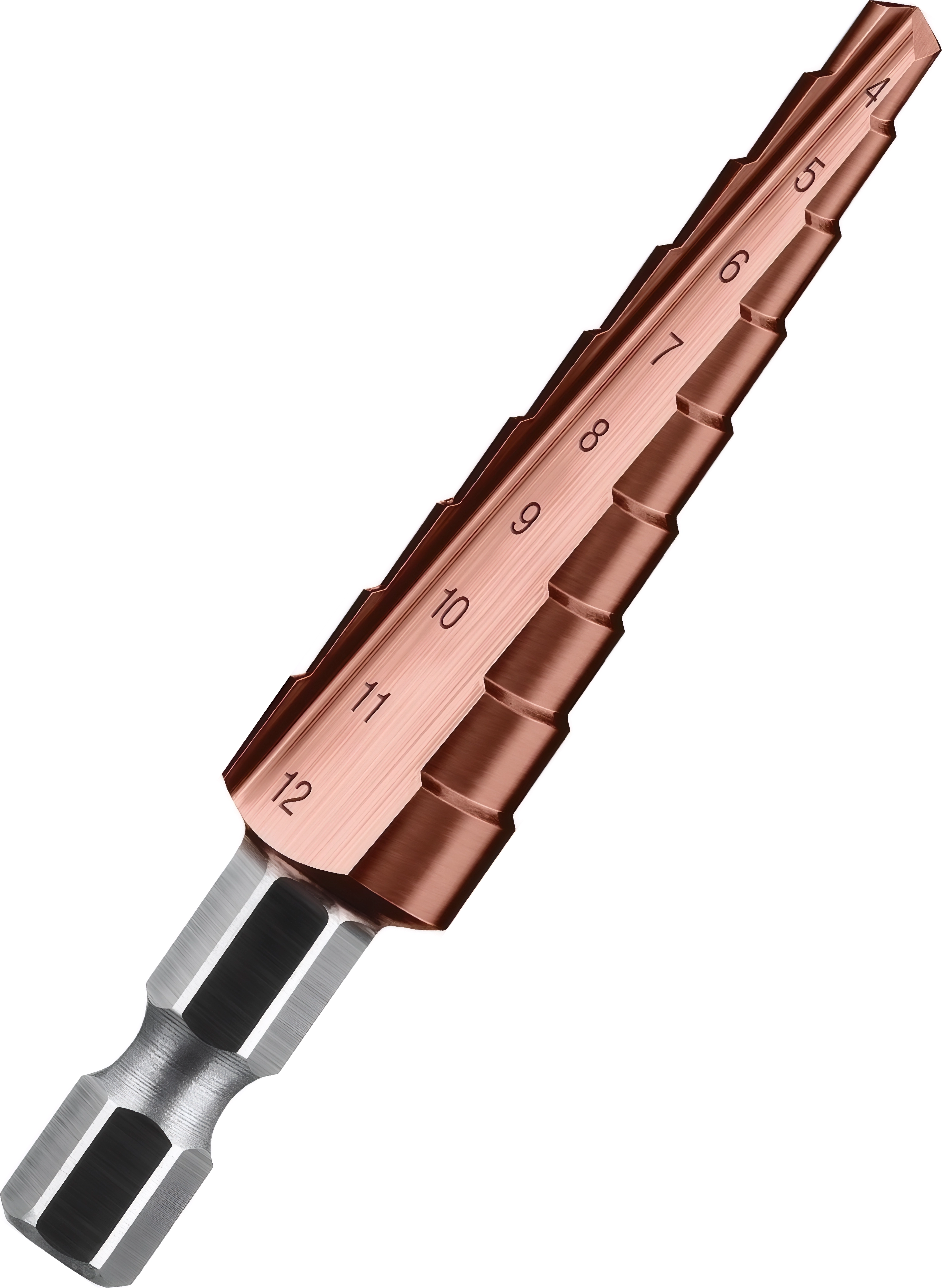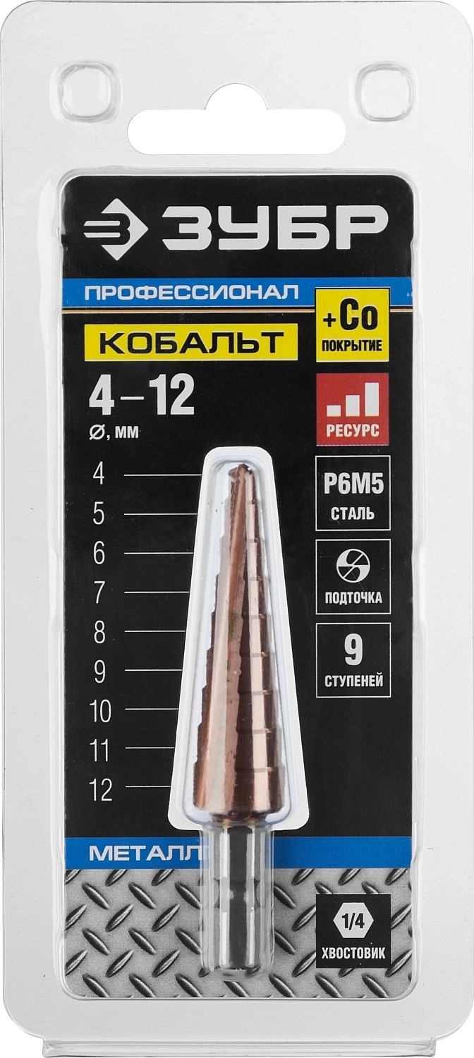 Ступенчатое сверло ЗУБР Кобальт 4-12 мм 9 ступеней сталь Р6М5 кобальтовое покрытие