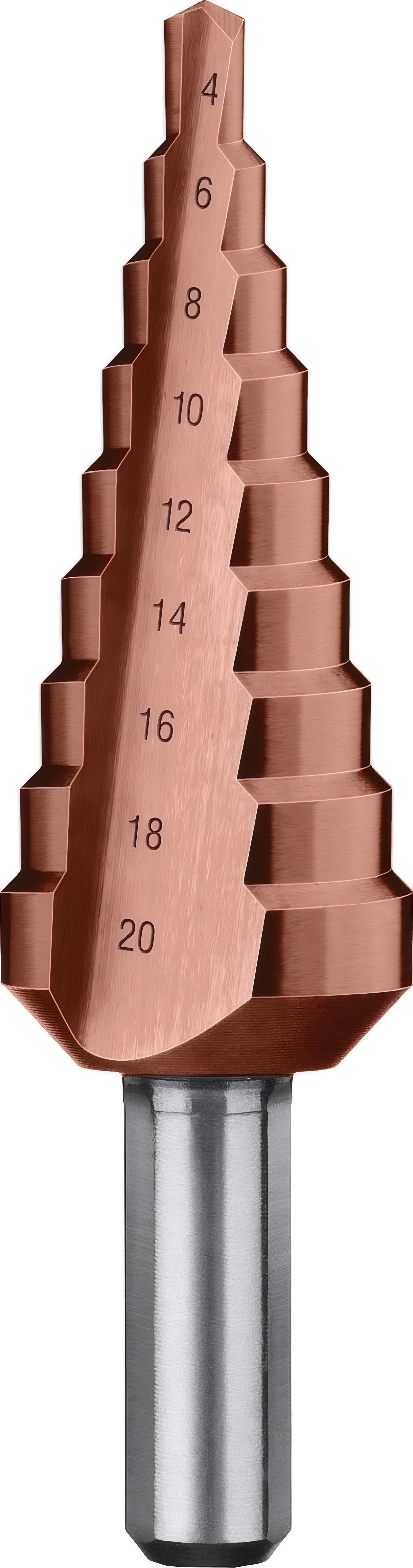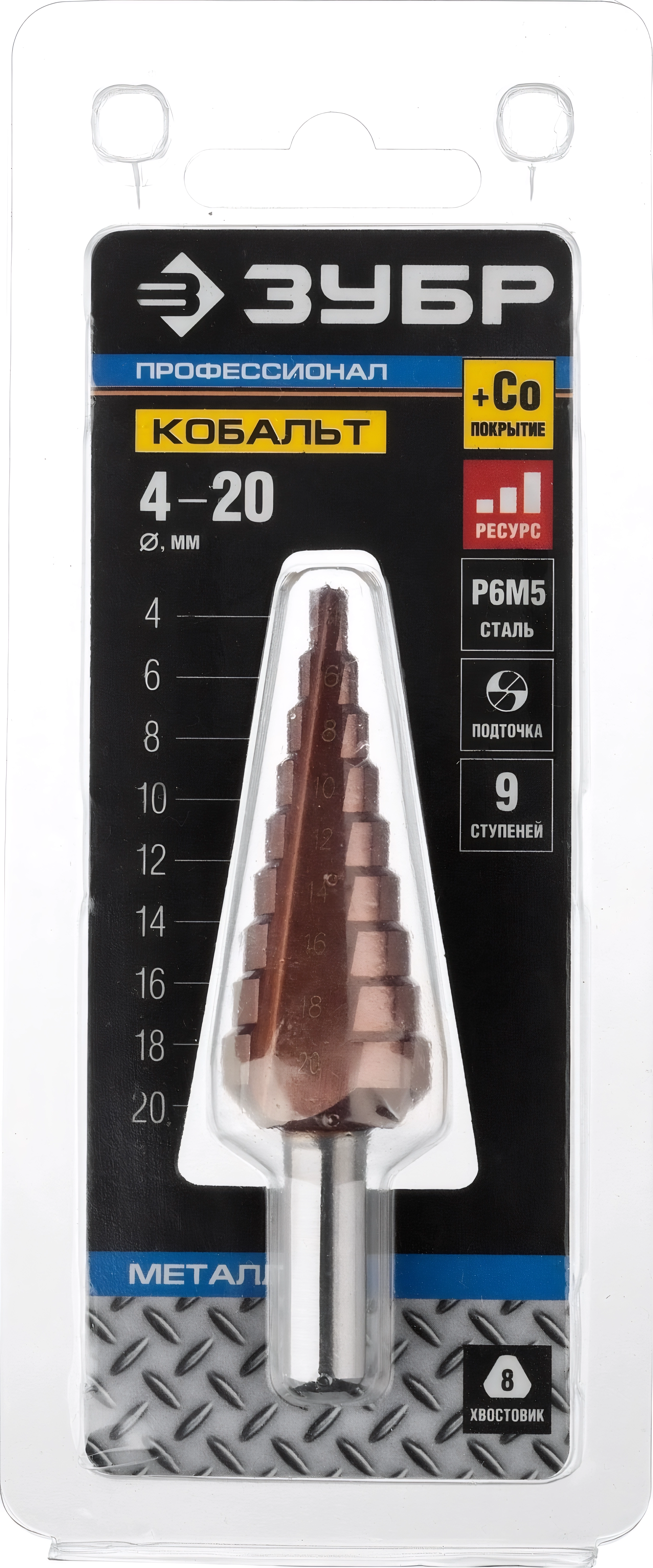 Ступенчатое сверло ЗУБР Кобальт 4-20 мм 9 ступеней сталь Р6М5 кобальтовое покрытие