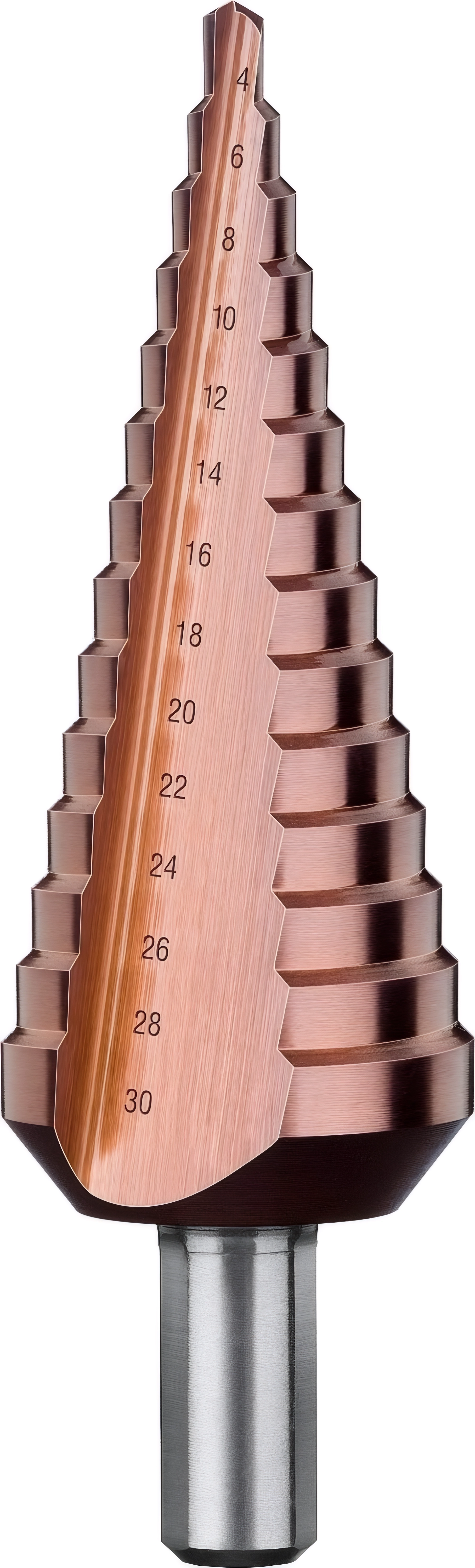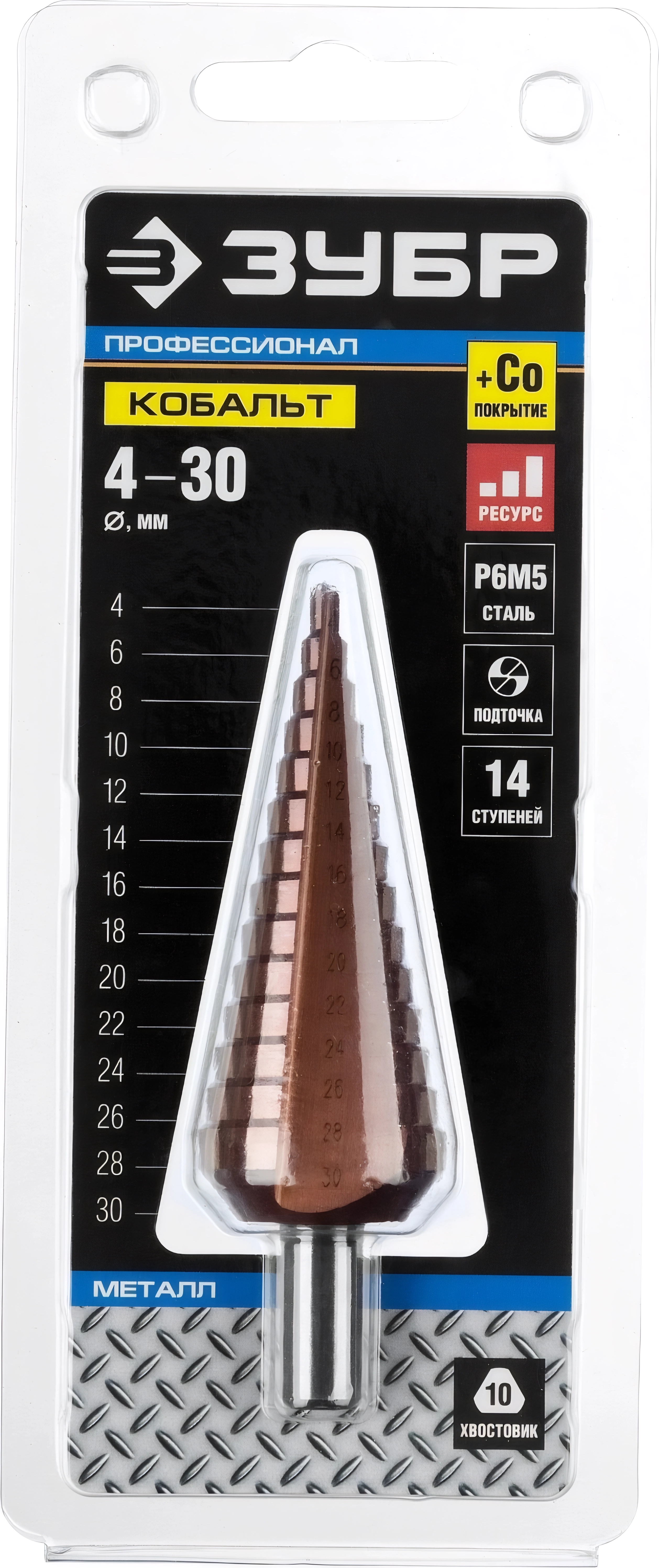 Ступенчатое сверло ЗУБР Кобальт 4-30 мм 14 ступеней сталь Р6М5 кобальтовое покрытие
