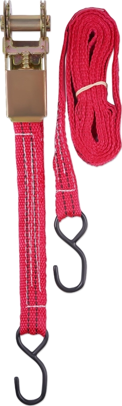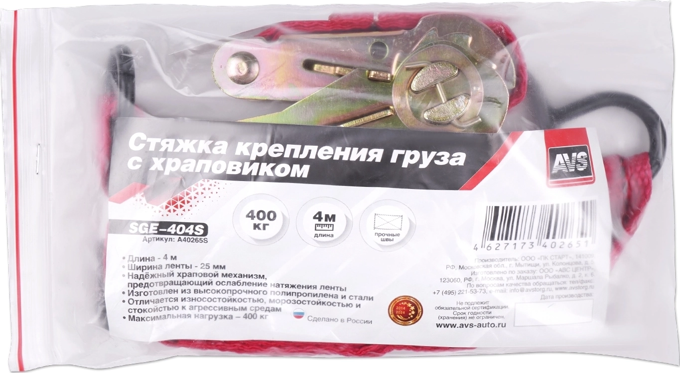 Стяжка крепления груза AVS SGE-404S (эконом) - длина ремня 4 м, ширина 2.5 см, лента из полипропилена, механизм храповый из стали, тоннажность 400 кг.