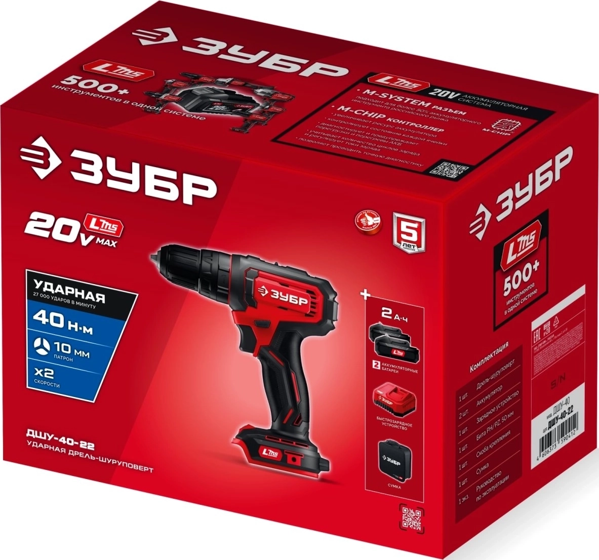 Ударная дрель-шуруповерт ЗУБР 20 В, 40 Н·м, 2 АКБ LMS (2 А·ч)