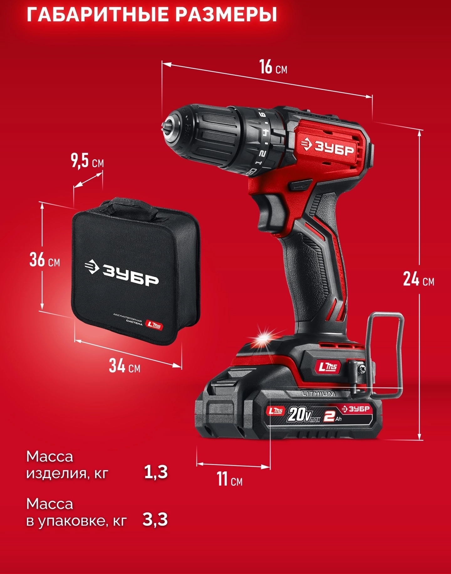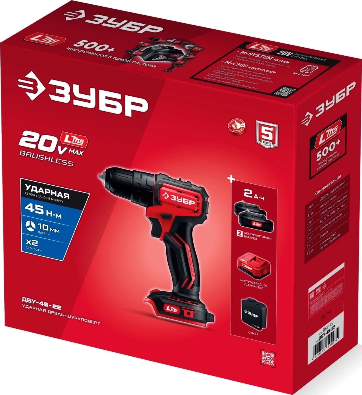 Бесщеточная ударная дрель-шуруповерт ЗУБР 20 В, 45 Н·м, 2 АКБ LMS (2 А·ч)