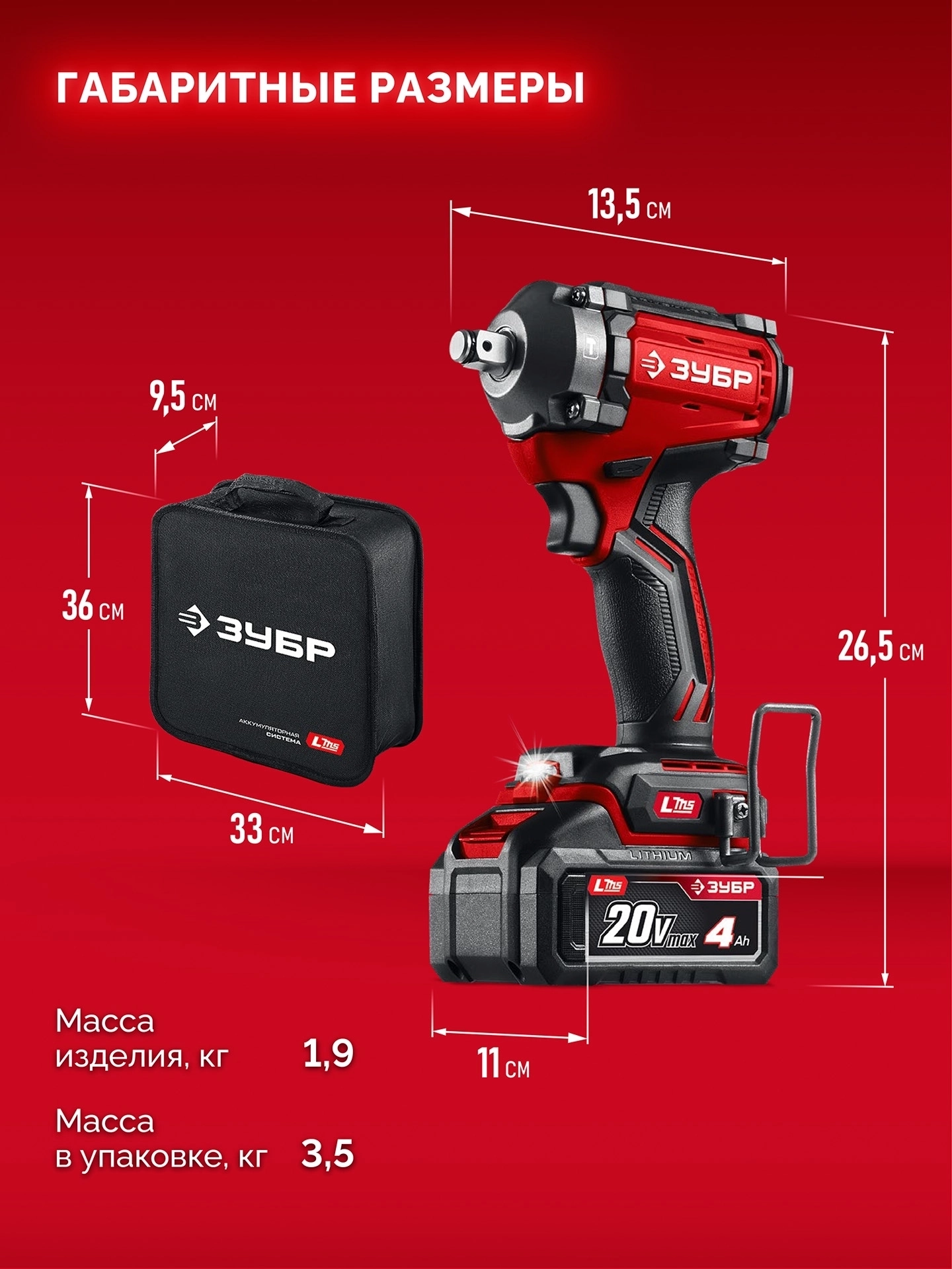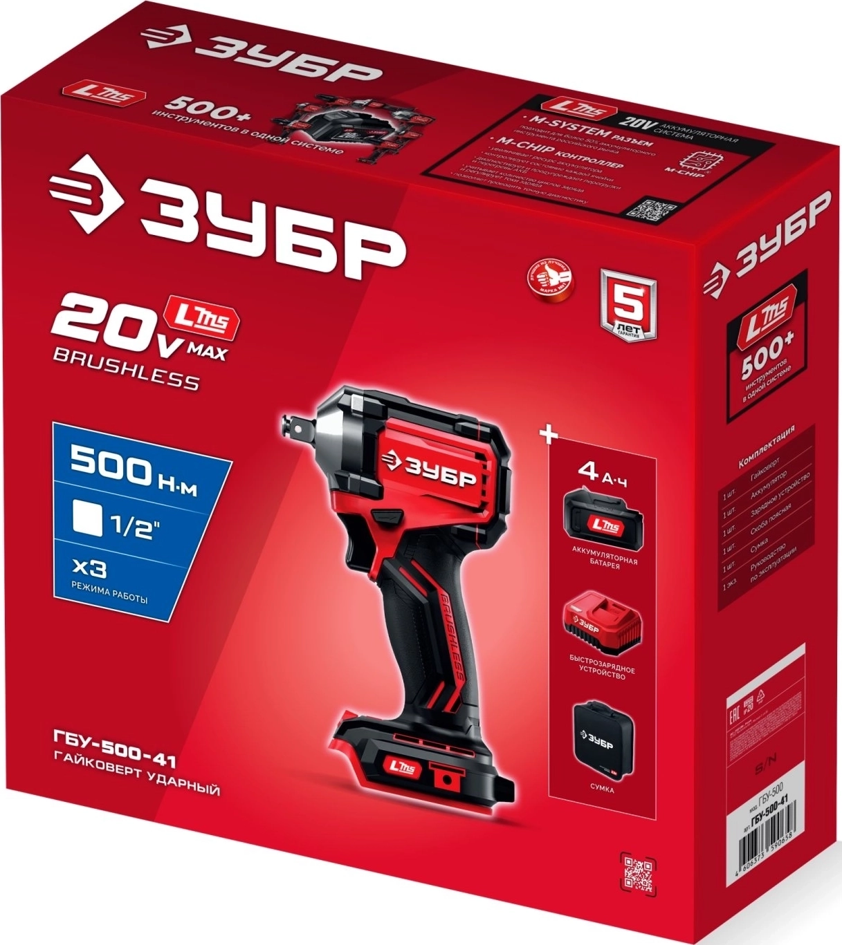 Бесщеточный ударный гайковерт ЗУБР 20 В, 500 Н·м, 1 АКБ LMS (4 А·ч)