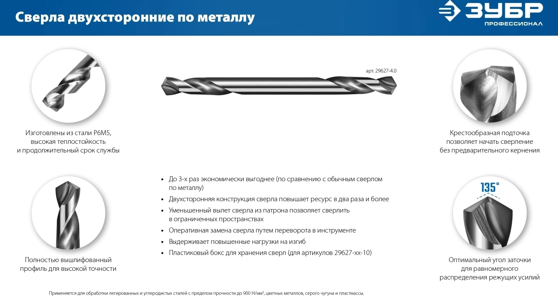 Сверло двухстороннее по металлу Проф-А ЗУБР 4.0х55мм, кл. А сталь Р6М5