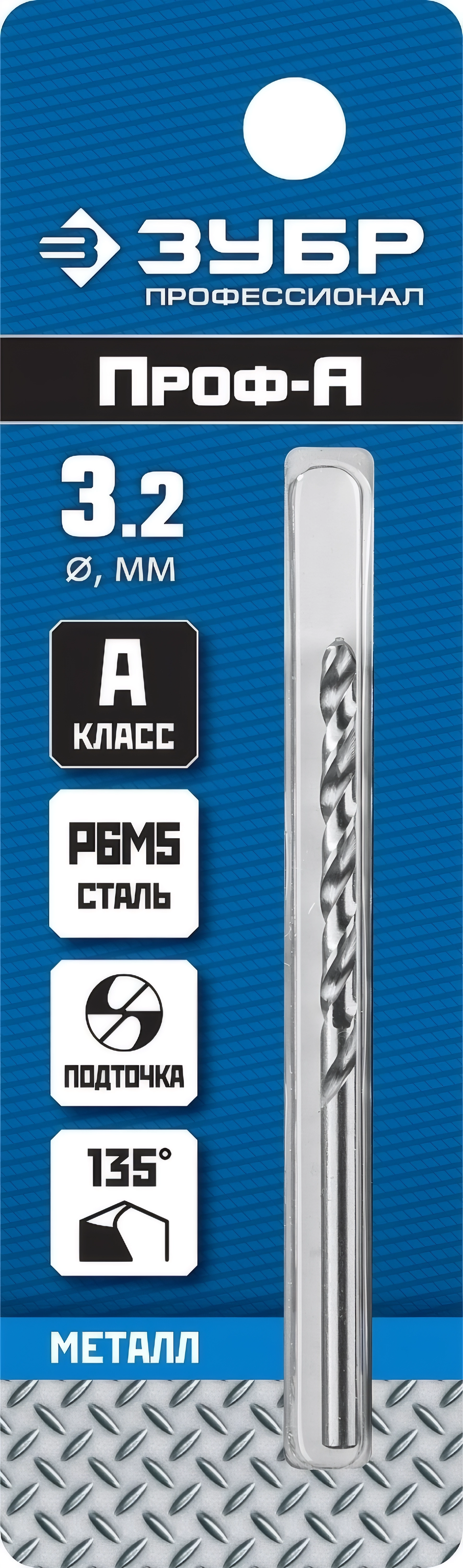 Сверло по металлу ЗУБР ПРОФ-А 3.2 х 65 мм сталь Р6М5 класс А