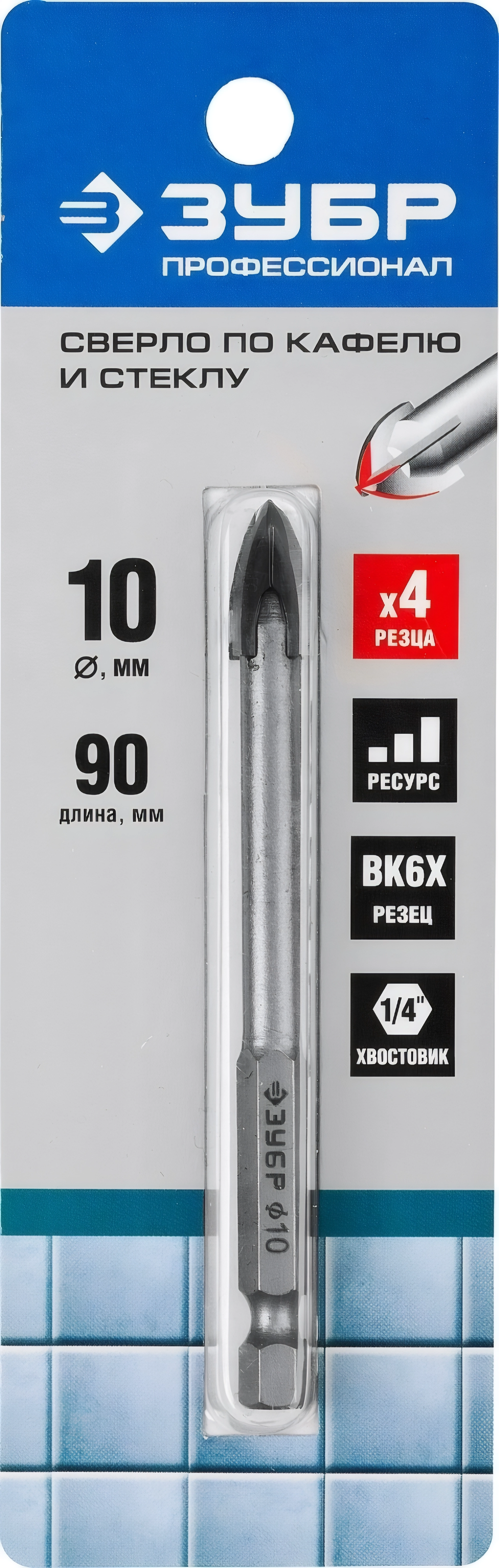 Сверло по стеклу и кафелю ЗУБР 10 мм 4х кромка HEX 1/4