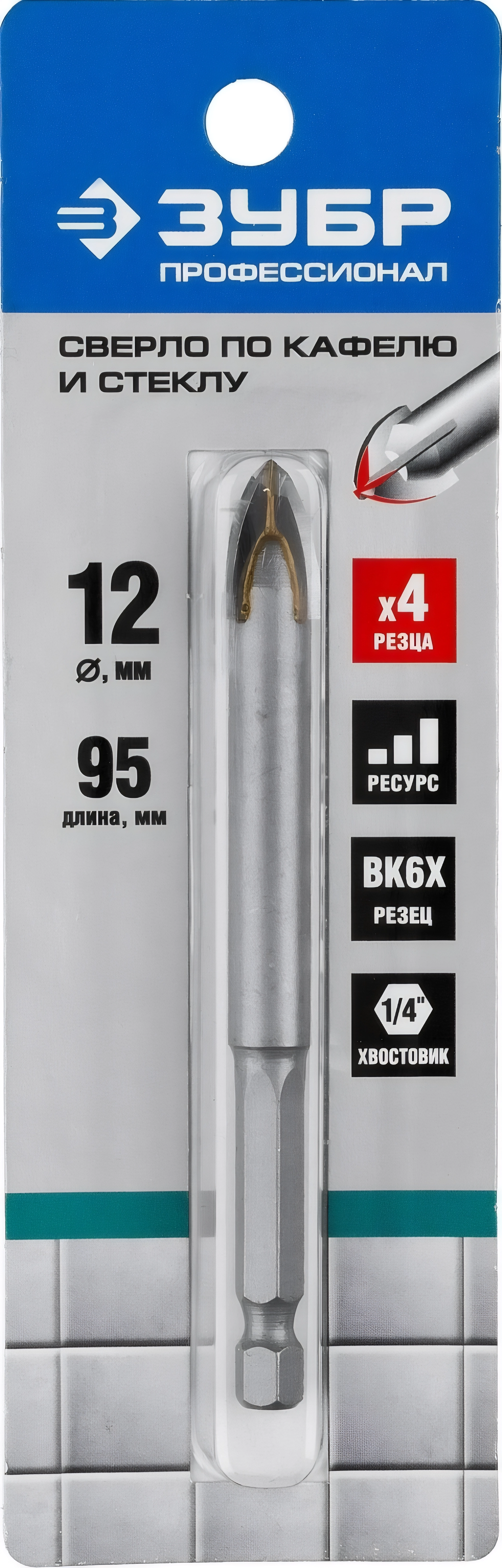 Сверло по стеклу и кафелю ЗУБР 12 мм 4х кромка HEX 1/4