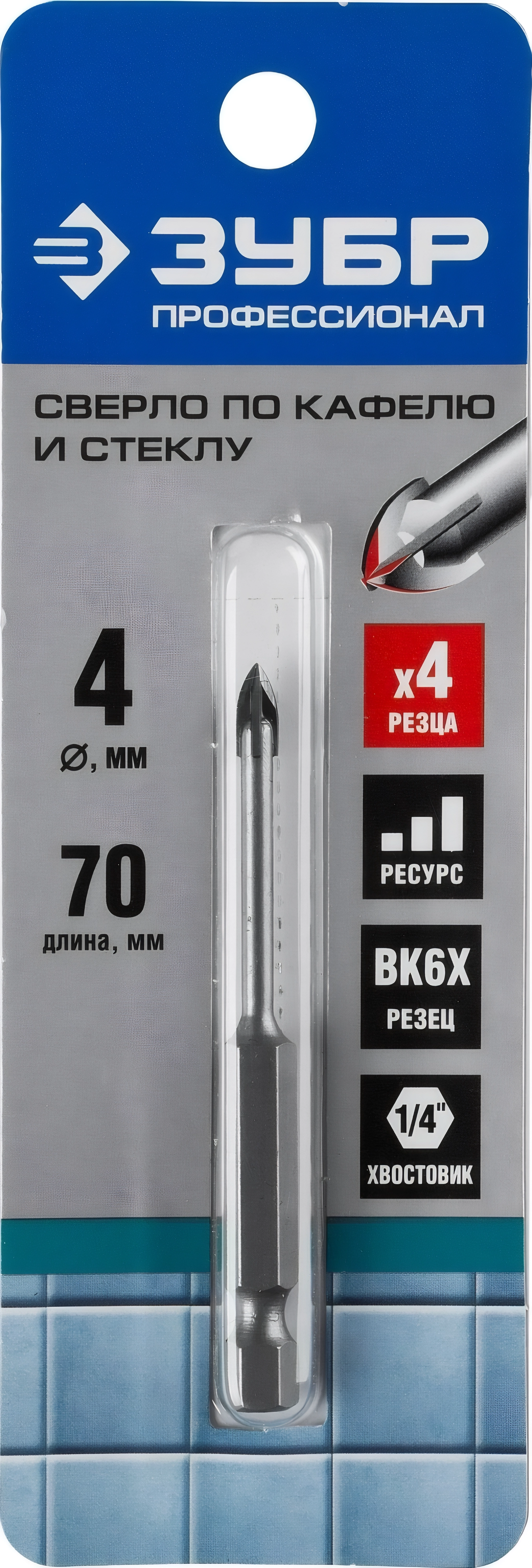 Сверло по стеклу и кафелю ЗУБР 4 мм 4х кромка HEX 1/4