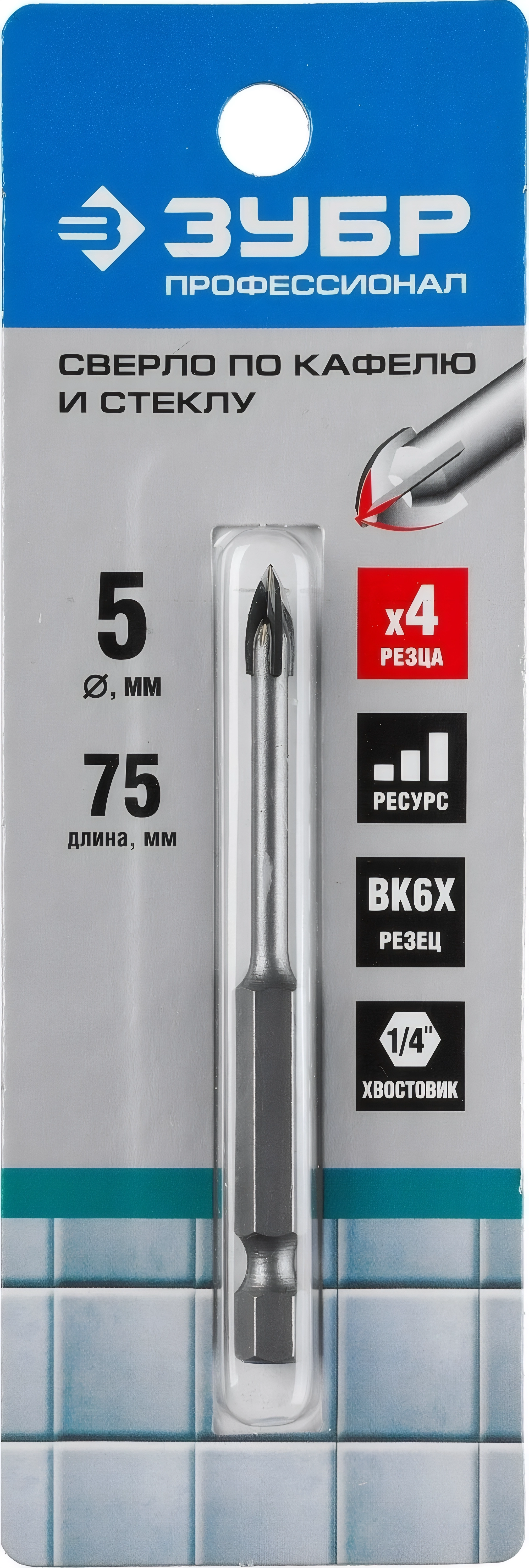 Сверло по стеклу и кафелю ЗУБР 5 мм 4х кромка HEX 1/4
