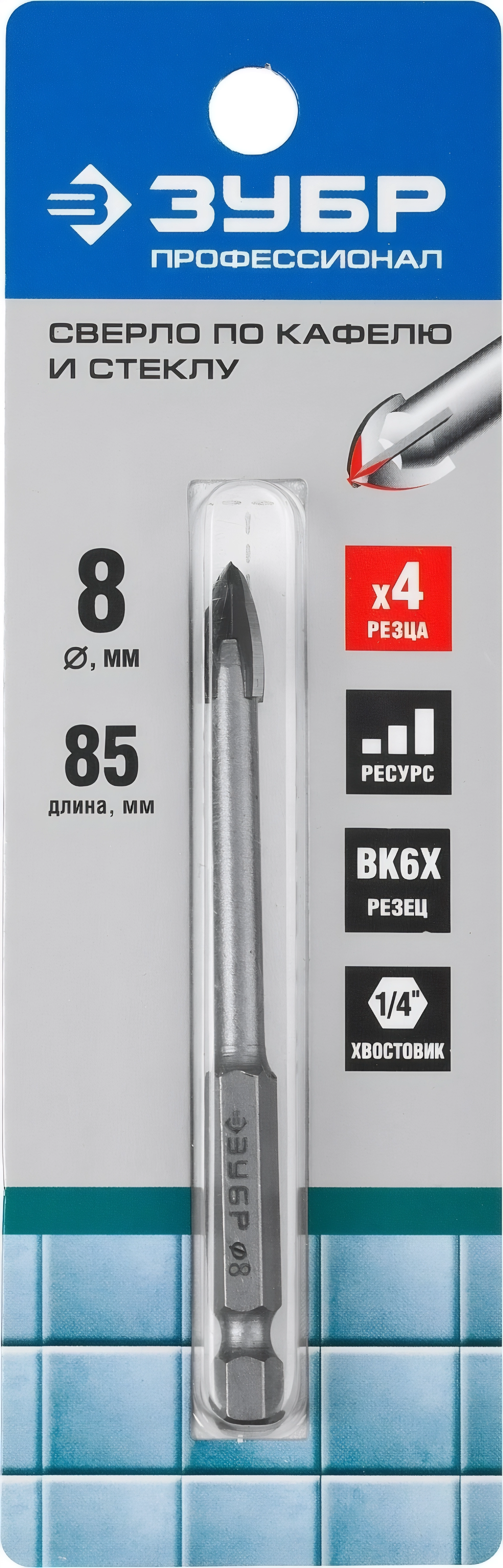 Сверло по стеклу и кафелю ЗУБР 8 мм 4х кромка HEX 1/4