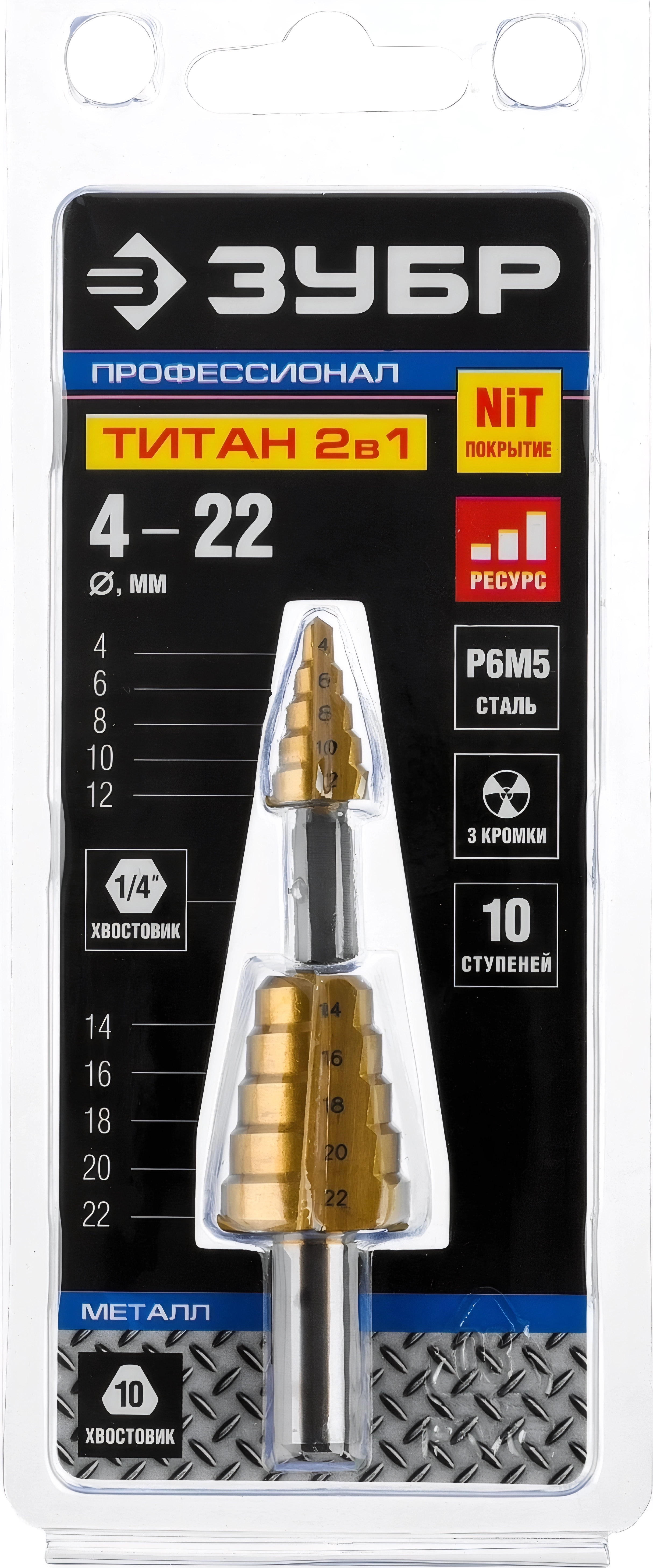 Сверло ступенчатое составное ЗУБР 4-22 мм, 10 ступеней, покрытие NiT