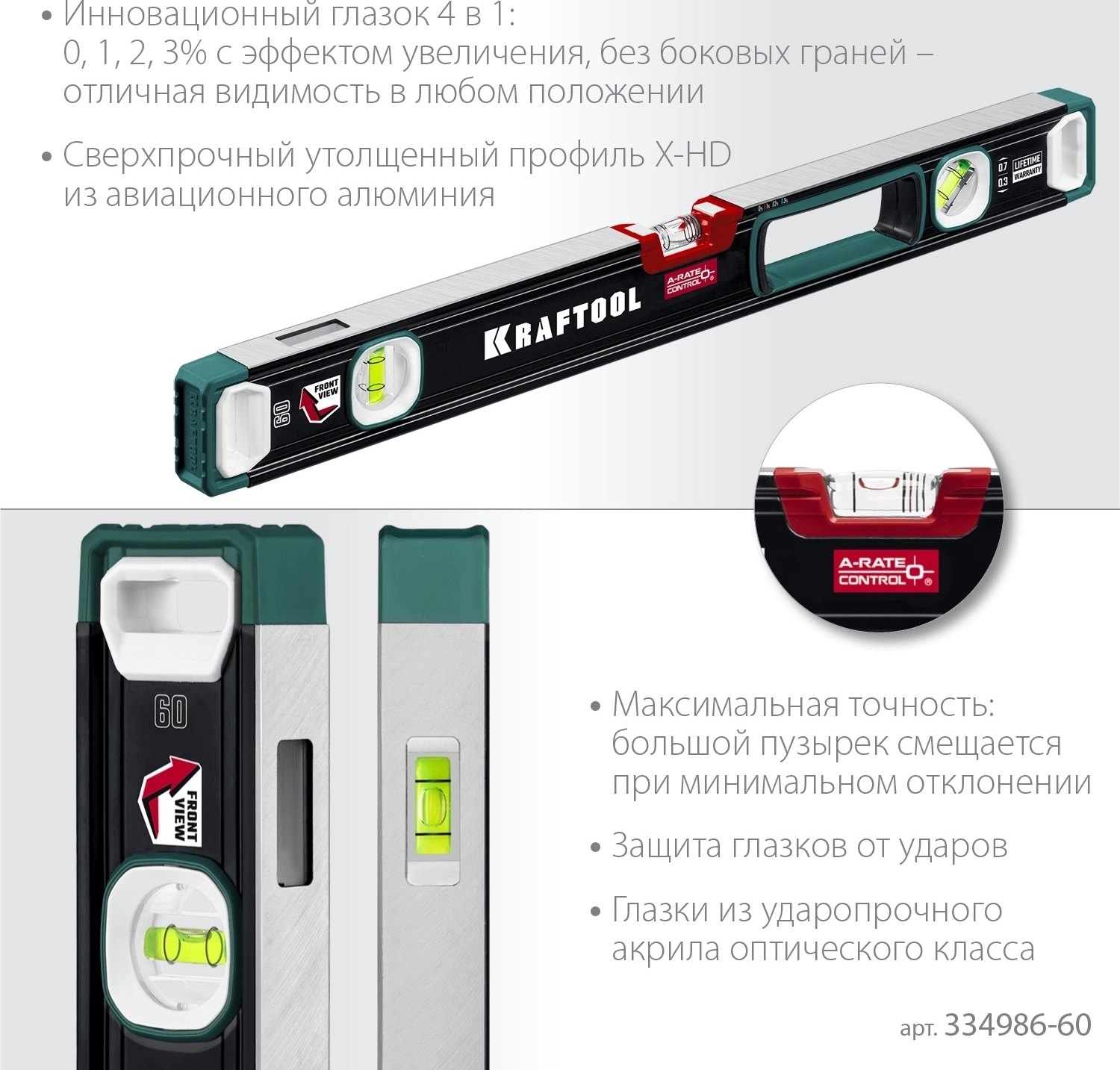 Сверхпрочный уровень KRAFTOOL A-RATE CONTROL, 600 мм, точность 0.3 мм/м, с инновационным зеркальным глазком