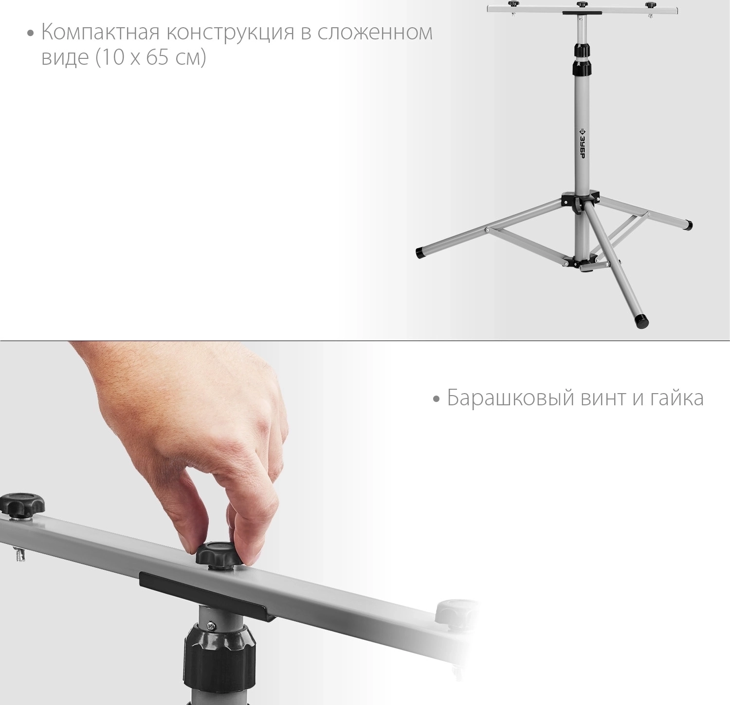 Штатив ЗУБР предназначен для установки прожекторов. Телескопическая конструкция позволяет регулировать высоту установки от 65 до 160 см. Горизонтальная перекладина позволяет одновременно установить 2 прожектора. Легкий и быстрый монтаж. Изготовлен из высокопрочной стали и выдерживает нагрузку до 8 кг. Размер в сложенном виде — 10х63 см. Диаметр основания треноги — 96 см.