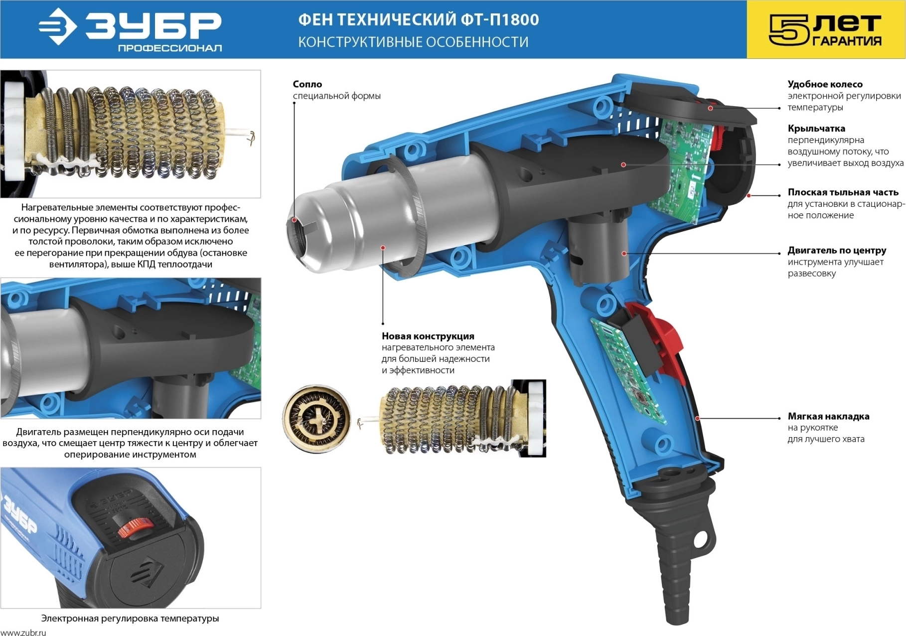 Модель профессионального уровня качества. Увеличенная толщина спиралей обеспечивает длительный срок службы нагревательного элемента. Точный контроль выходной температуры и ламинарный воздушный поток гарантируют высокое качество выходного воздуха. Плавная регулировка температуры позволяет использовать изделие для широкого спектра работ