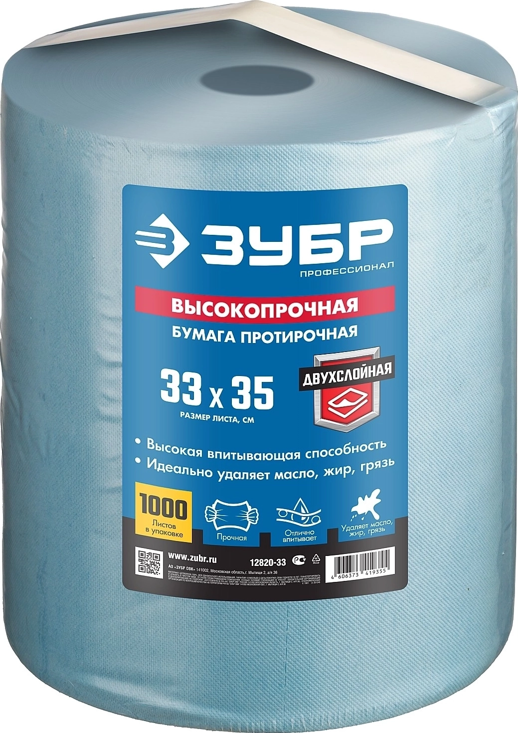 ЗУБР 12820-33 Протирочная бумага 33 х 35 см 2-х слойная в рулоне 1000 листов арт. 109423