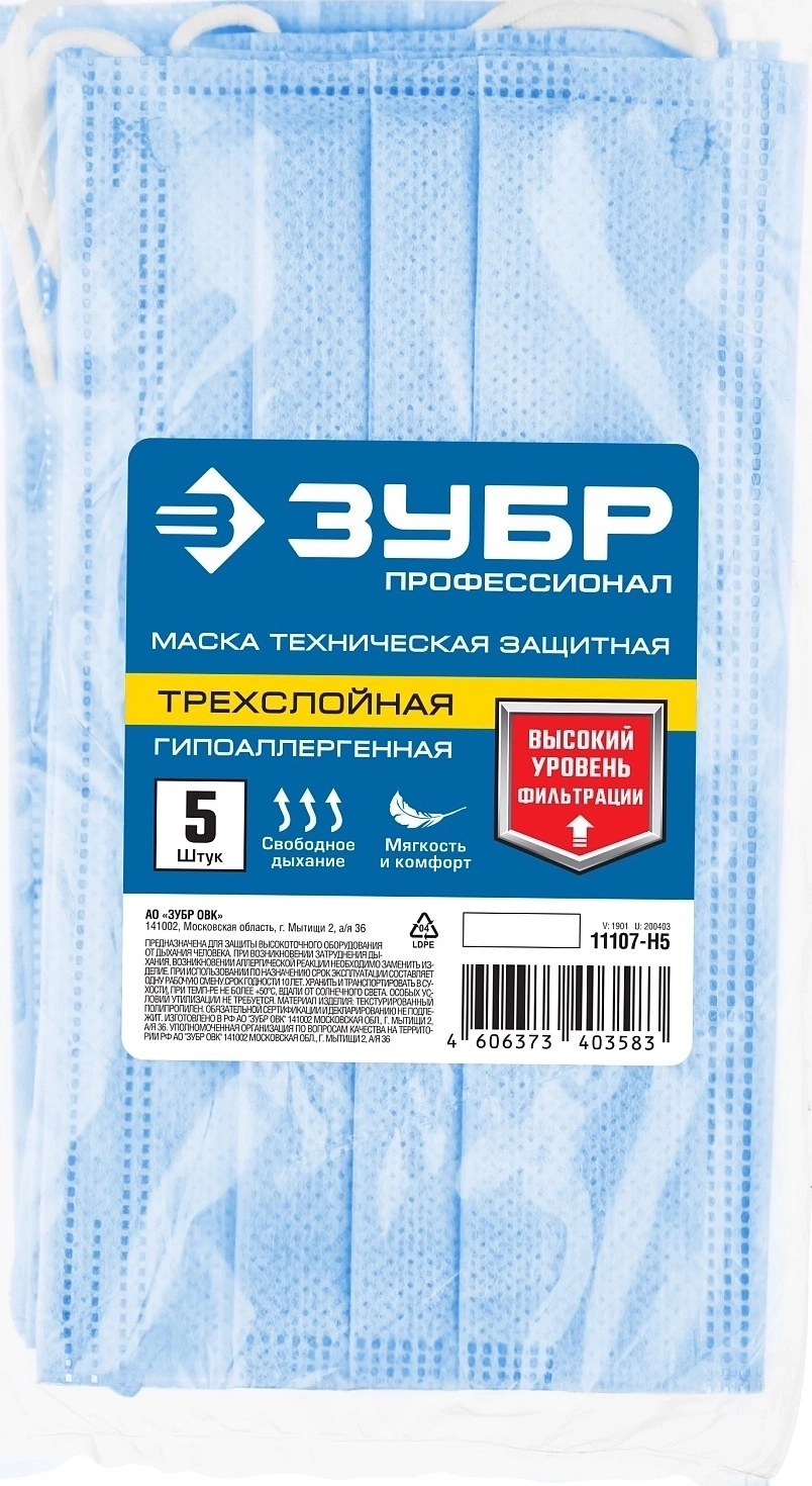 Трехслойная техническая защитная маска ЗУБР гипоаллергенная 5 шт