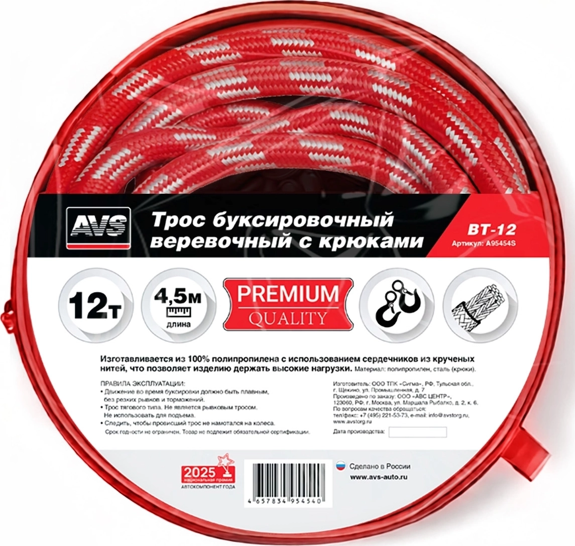 Трос буксировочный AVS BT-12, веревочный с крюками, 12т, 4.5м, в сумке