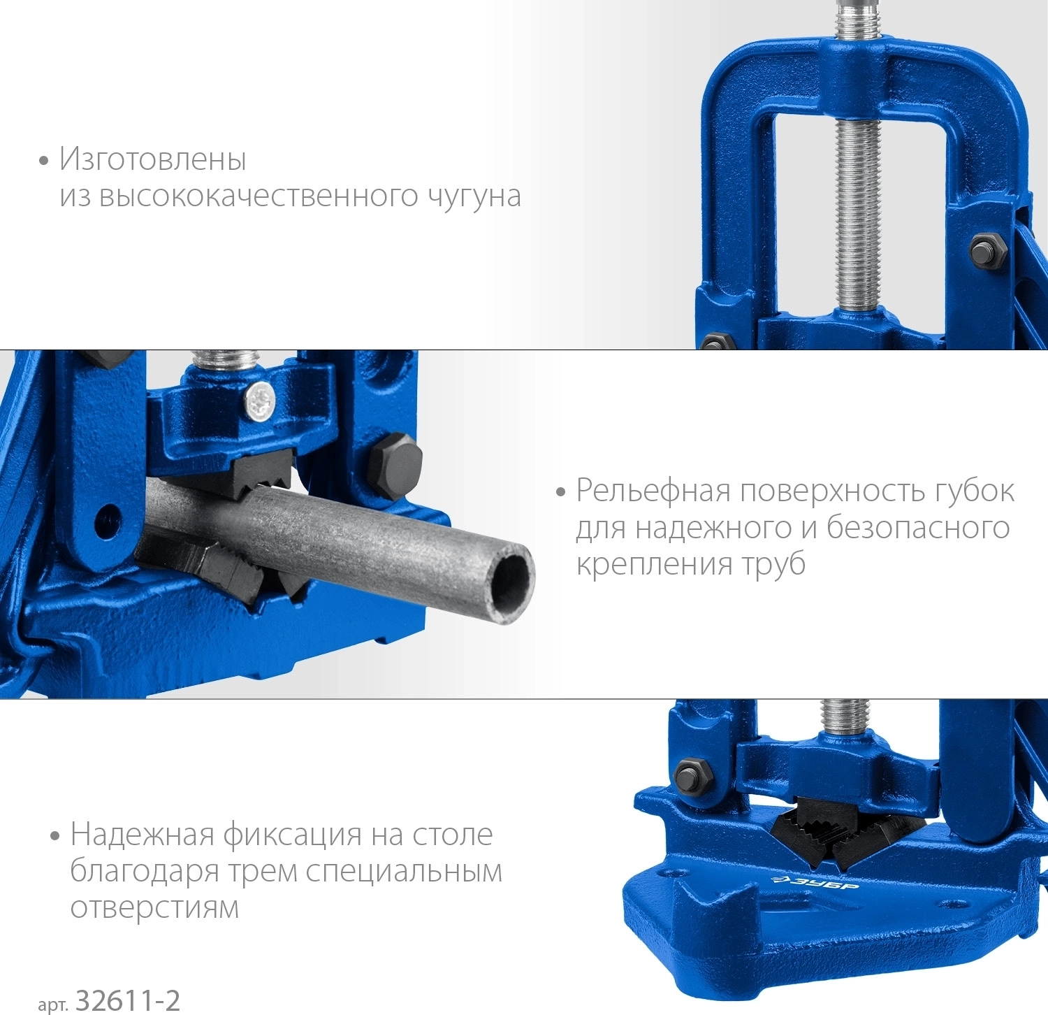 - Рельефная поверхность губок для надежного и безопасного крепления труб