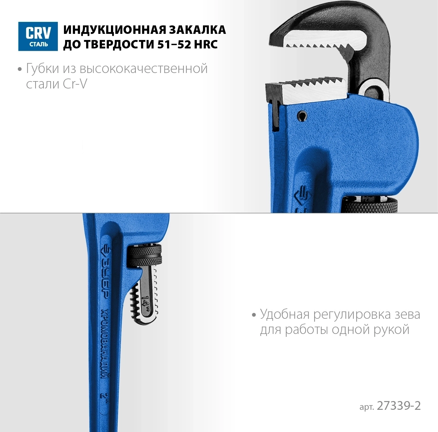 - Губки изготовлены из высококачественной хромованадиевой стали. Для увеличения износостойкости зубцы подвергнуты индукционной закалке токами высокой частоты до твердости 53 - 59 HRC. Цельнолитая конструкция и специальная форма губок позволяют применять инструмент при высоких нагрузках. Угол наклона зубьев обеспечивает максимально возможное усилие захвата. Специальная конструкция подвижной