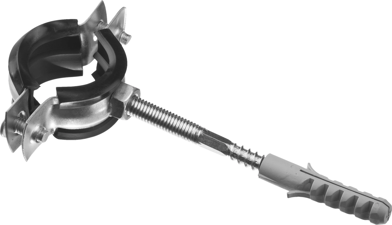- Комплектность набора позволяет крепить хомут как с помощью гайки, так и с использованием шпильки и дюбеля
