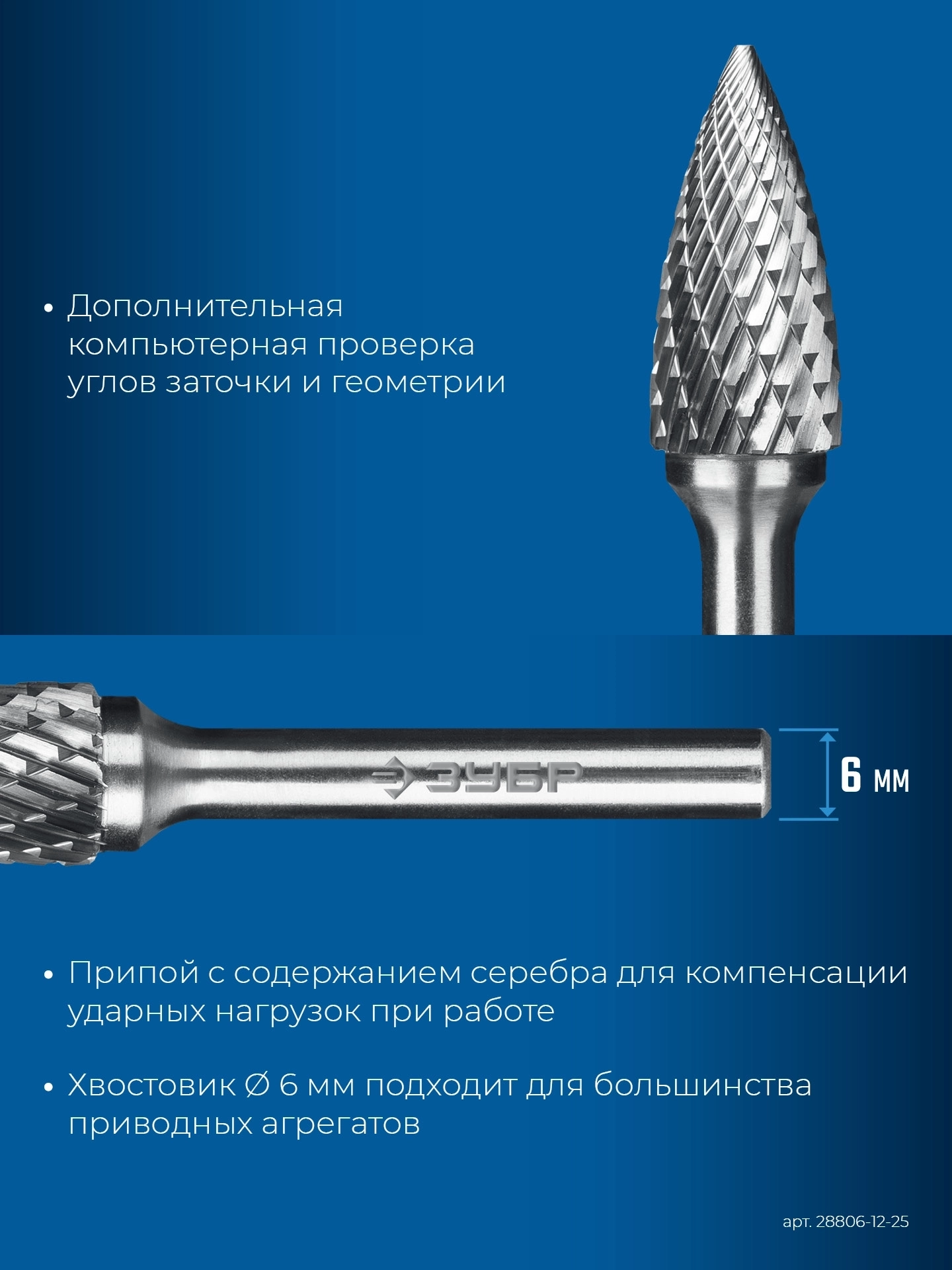 Твердосплавная борфреза ЗУБР 12х25 мм тип G парабола с острым углом хв-к 6 мм