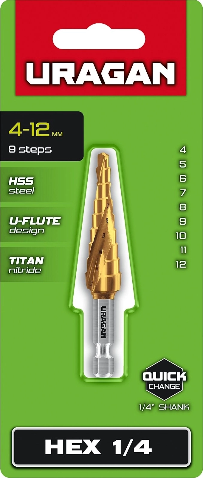 Сверло ступенчатое URAGAN 4-12мм, 9 ступеней, винтовая спираль