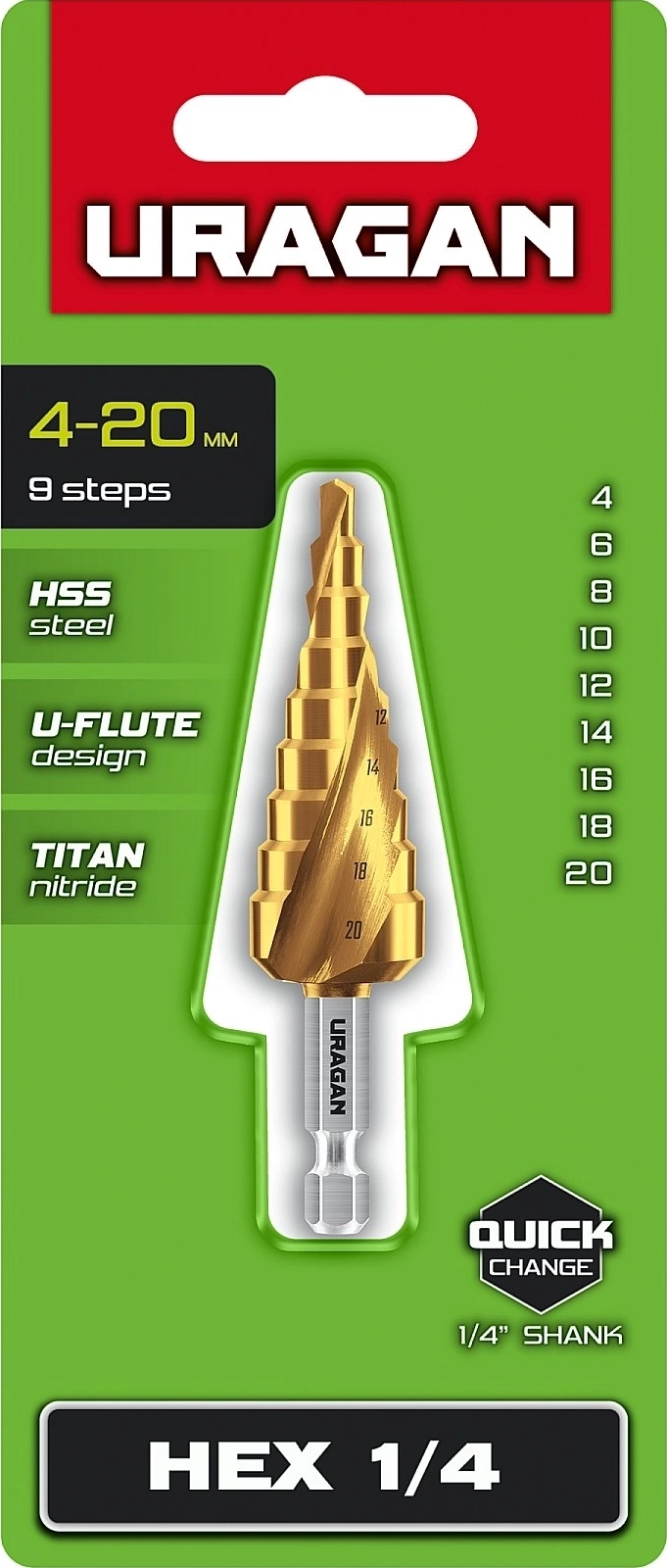 Сверло ступенчатое URAGAN 4-20мм, 9 ступеней, винтовая спираль