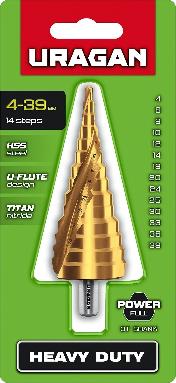 Сверло ступенчатое URAGAN 4-39мм, 14 ступеней, винтовая спираль