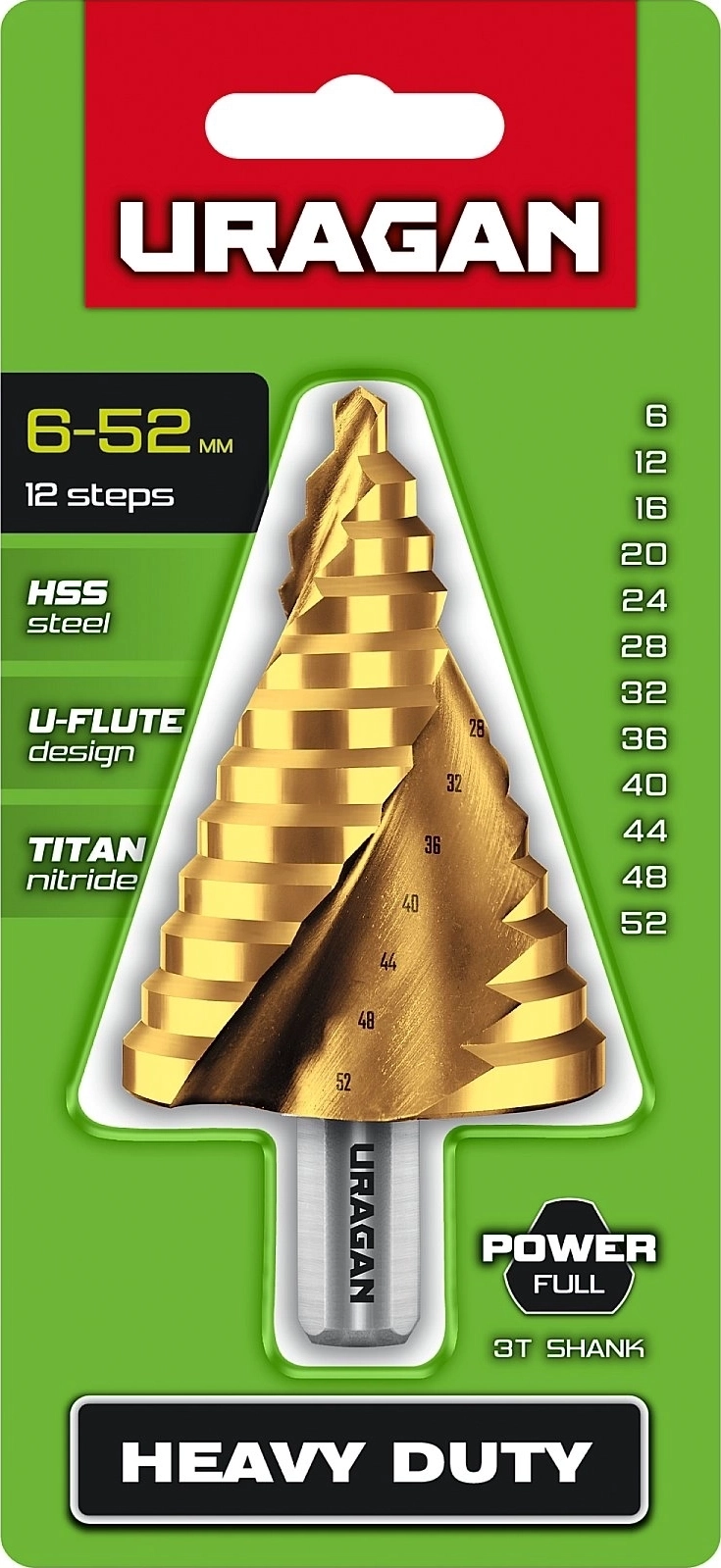 Сверло ступенчатое URAGAN 6-52мм, 12 ступеней, винтовая спираль
