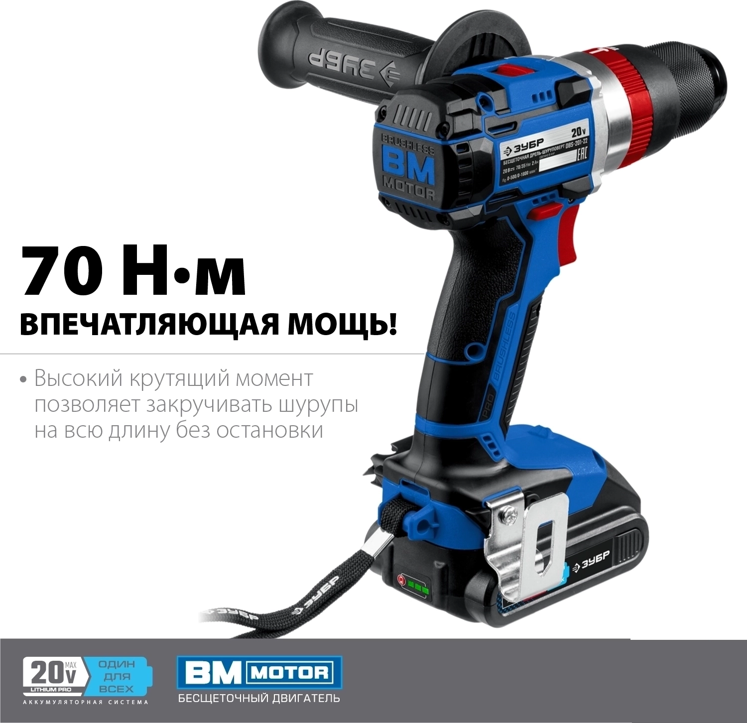 Ударная дрель-шуруповерт бесщеточная ЗУБР Т7 20 В 70 Н·м 2 АКБ 2 А·ч кейс