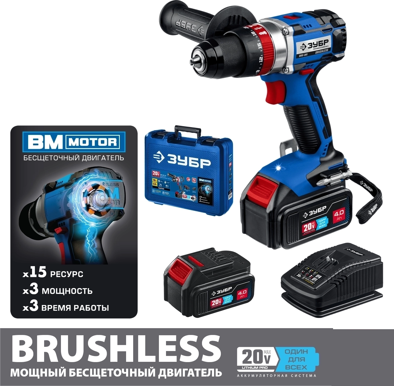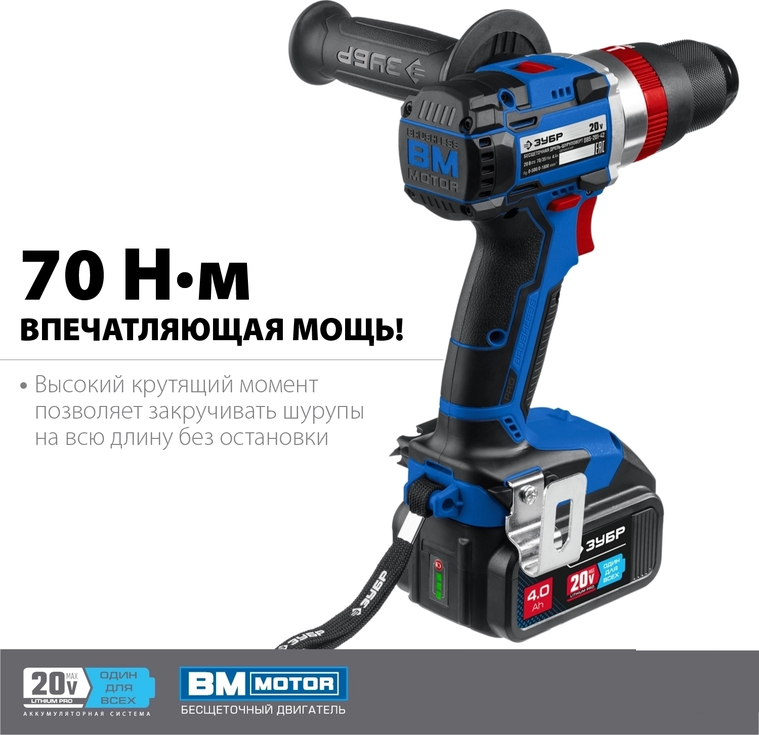 Ударная дрель-шуруповерт бесщеточная ЗУБР Т7 20 В 70 Н·м 2 АКБ 4 А·ч кейс