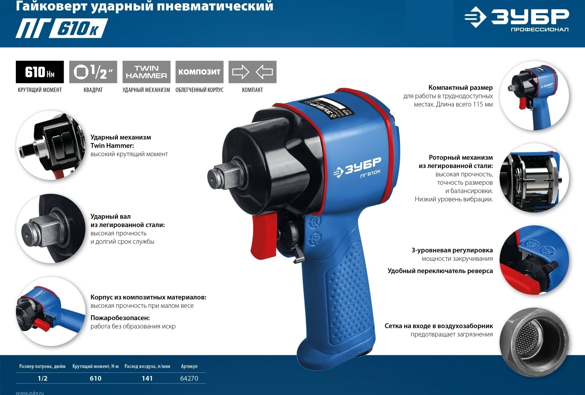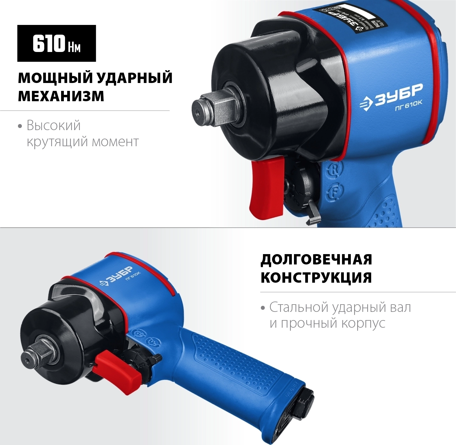Ударный пневматический гайковерт +M675 ЗУБР ПГ-610К 1/2″ 610 Н·м