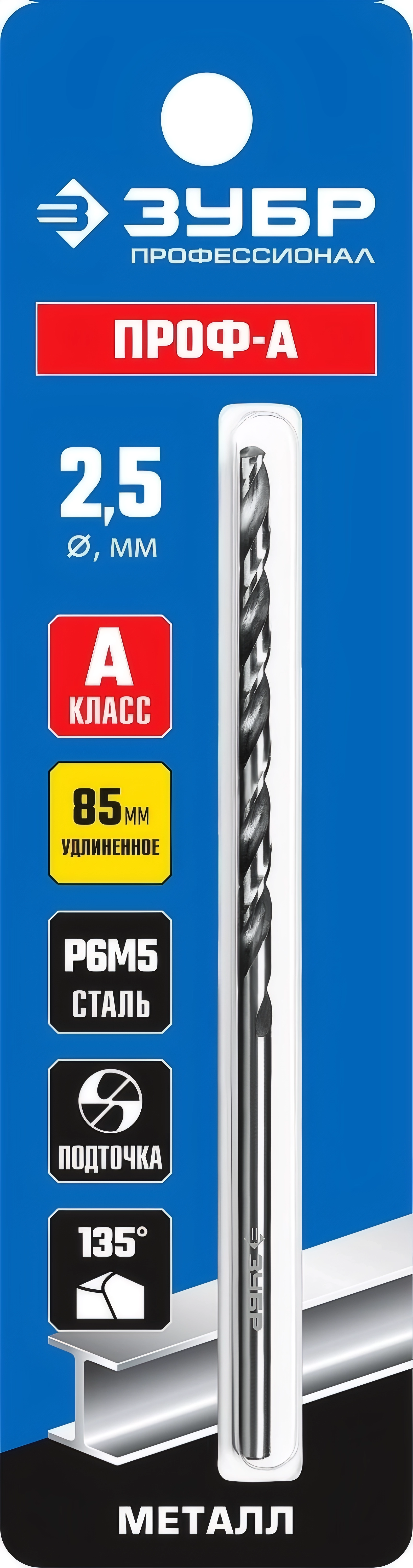 Удлиненное сверло по металлу ЗУБР ПРОФ-А 2.5 х 95 мм сталь Р6М5 класс А