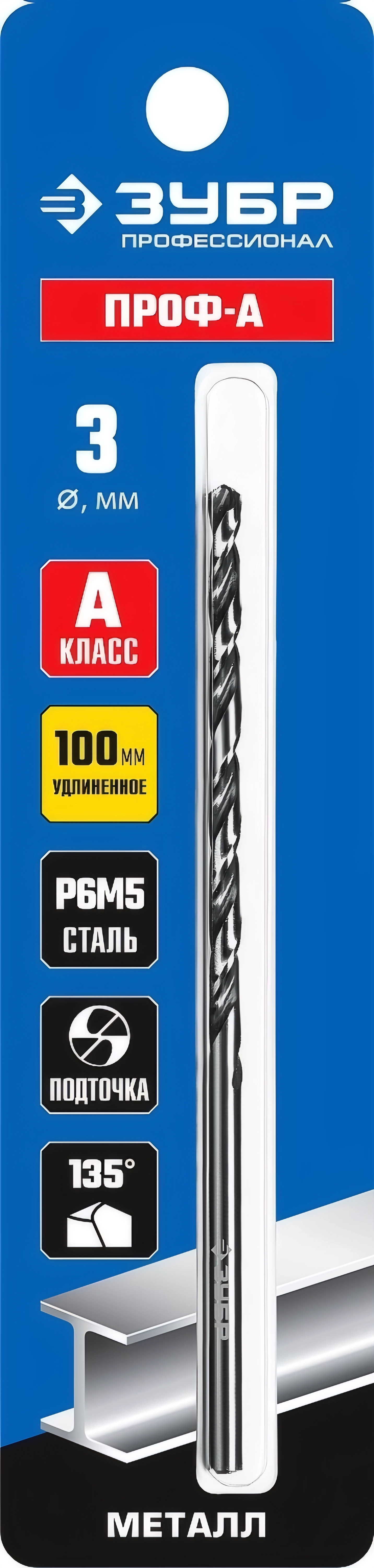 Удлиненное сверло по металлу ЗУБР ПРОФ-А 3.0 х 100 мм сталь Р6М5 класс А