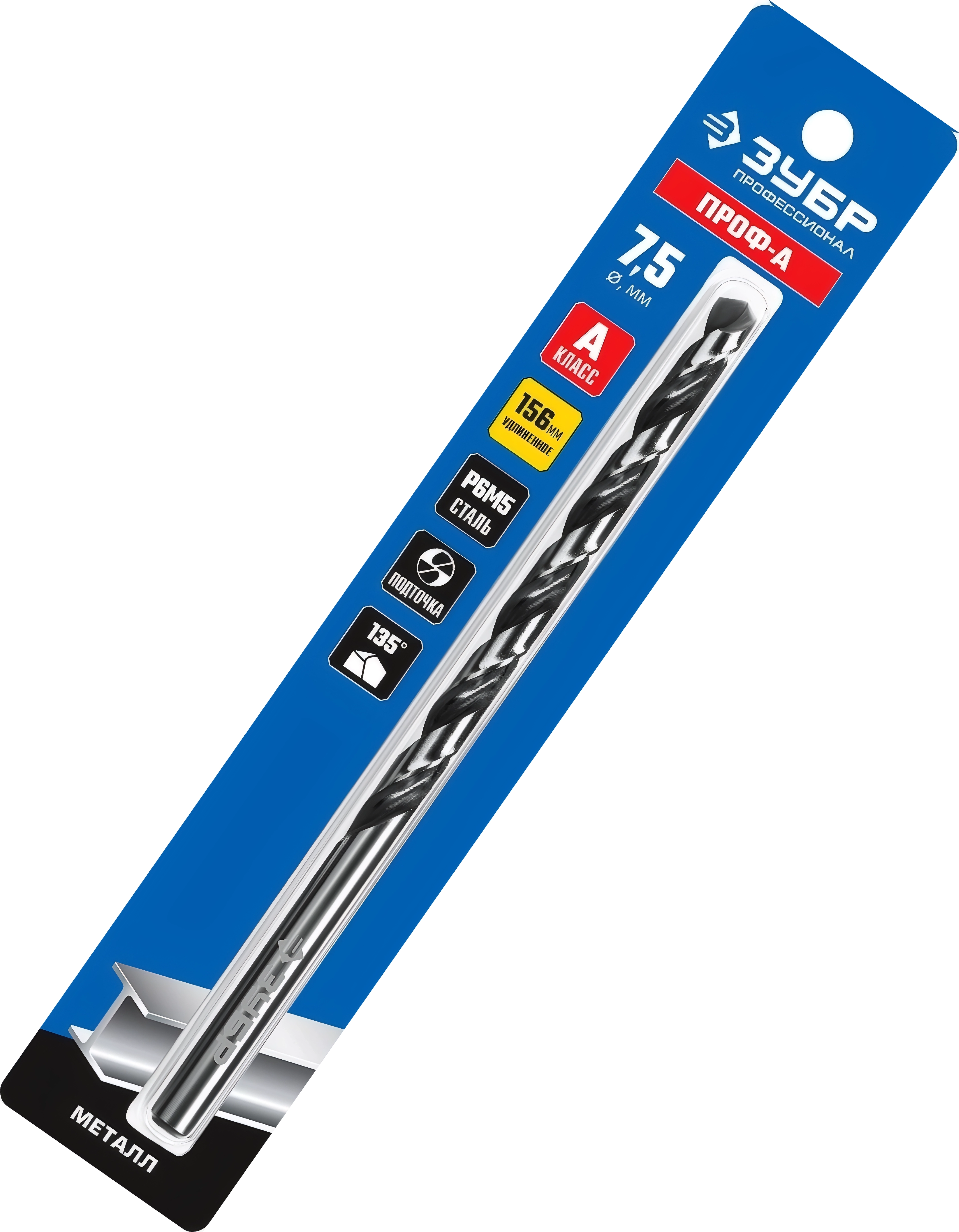 Удлиненное сверло по металлу ЗУБР ПРОФ-А 7.5 х 156 мм сталь Р6М5 класс А