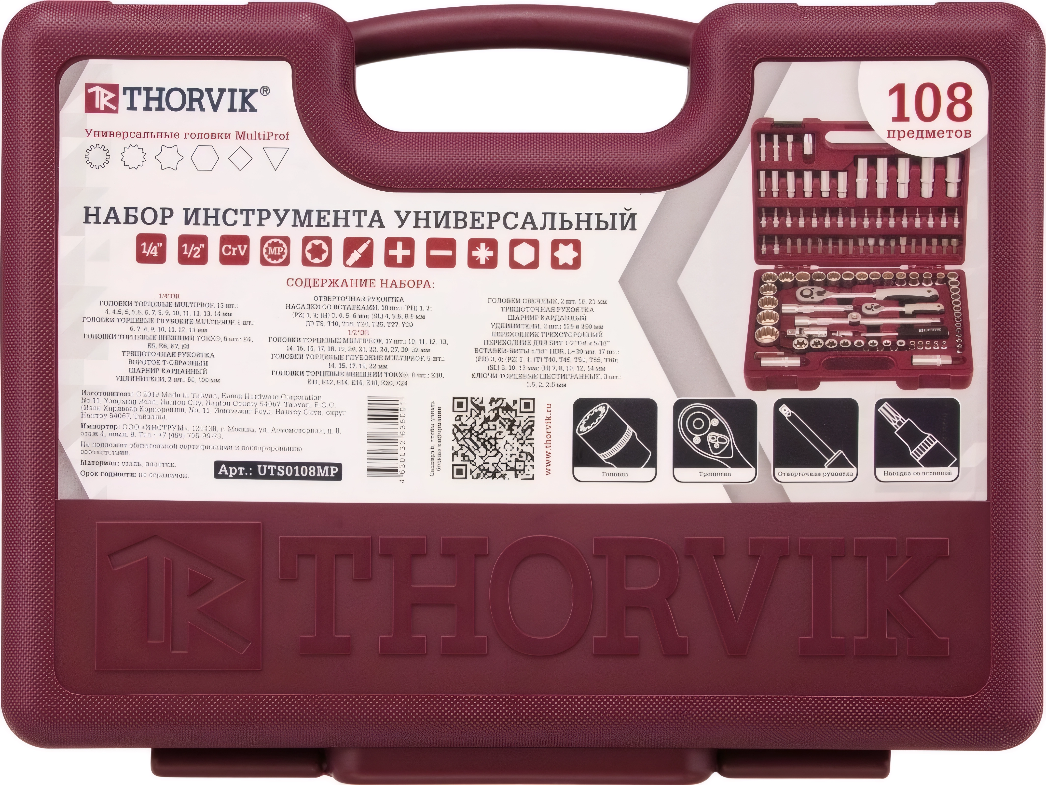 Набор инструмента универсальный - 108 предметов (головки MultiProf 1/4, 1/2, биты, ключи, ... арт. 61724