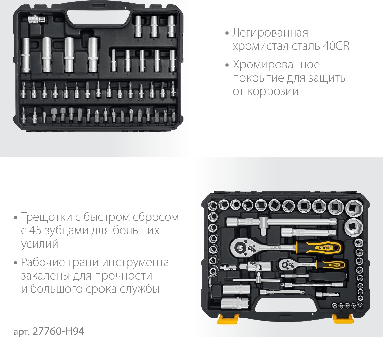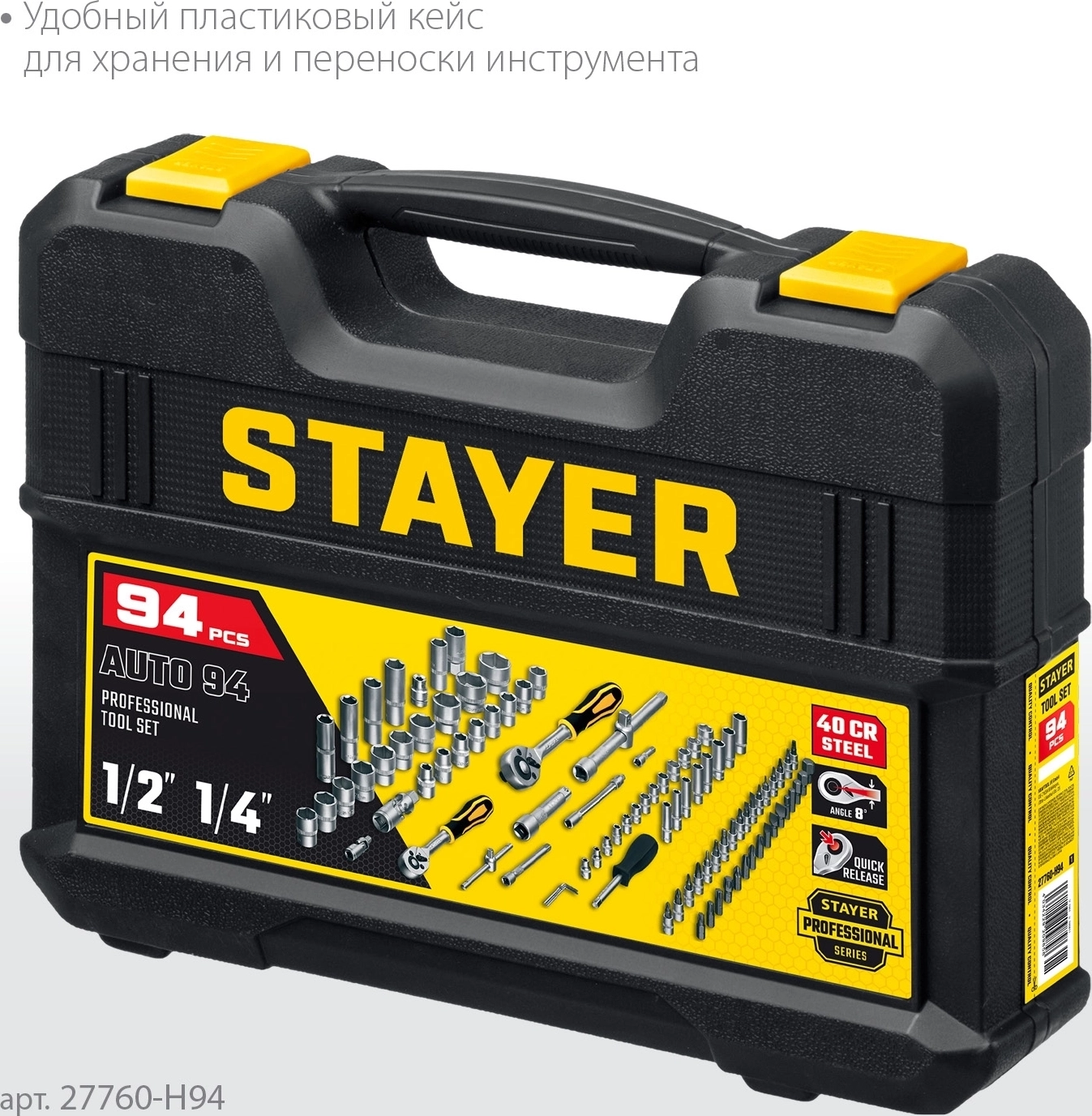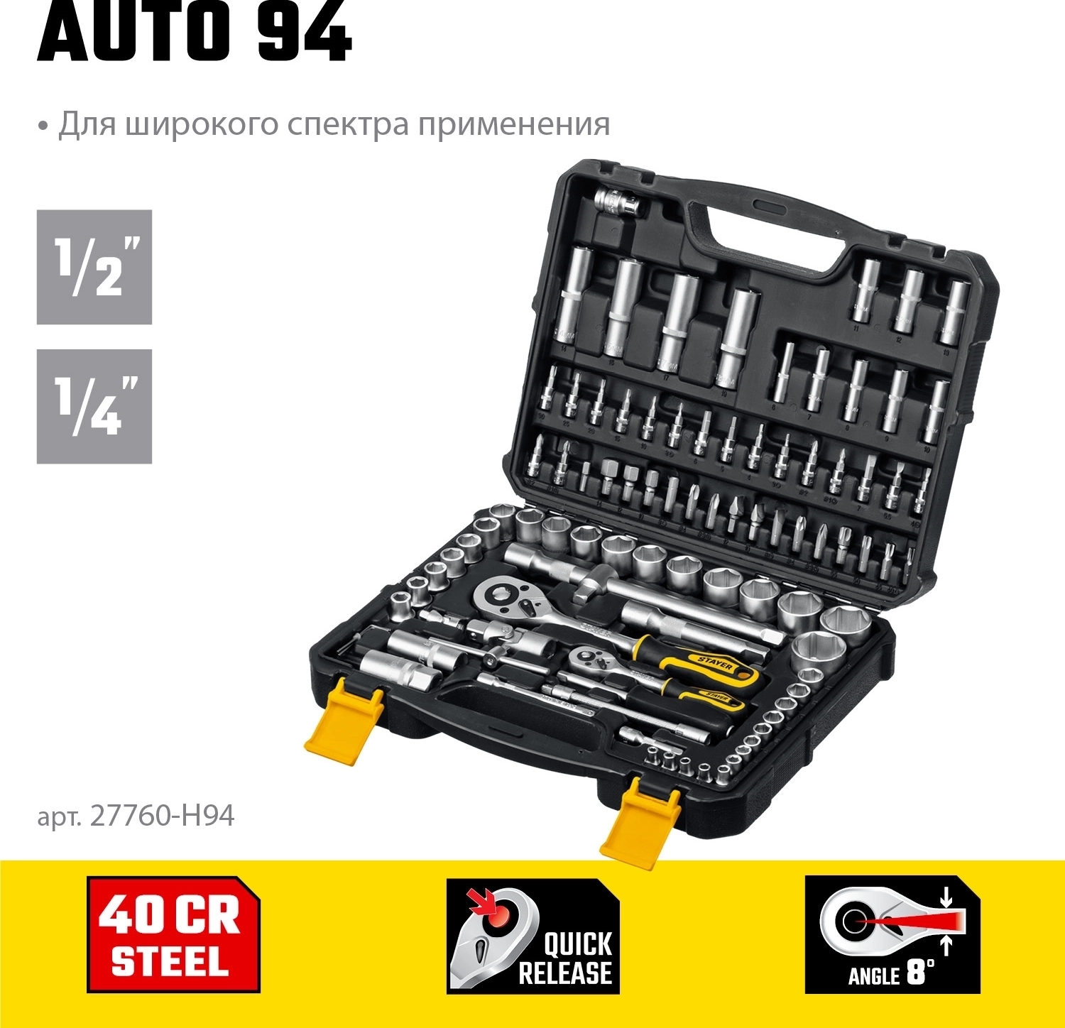 Универсальный набор инструмента STAYER Professional AUTO 94 94 предм. (1/2″+1/4″)