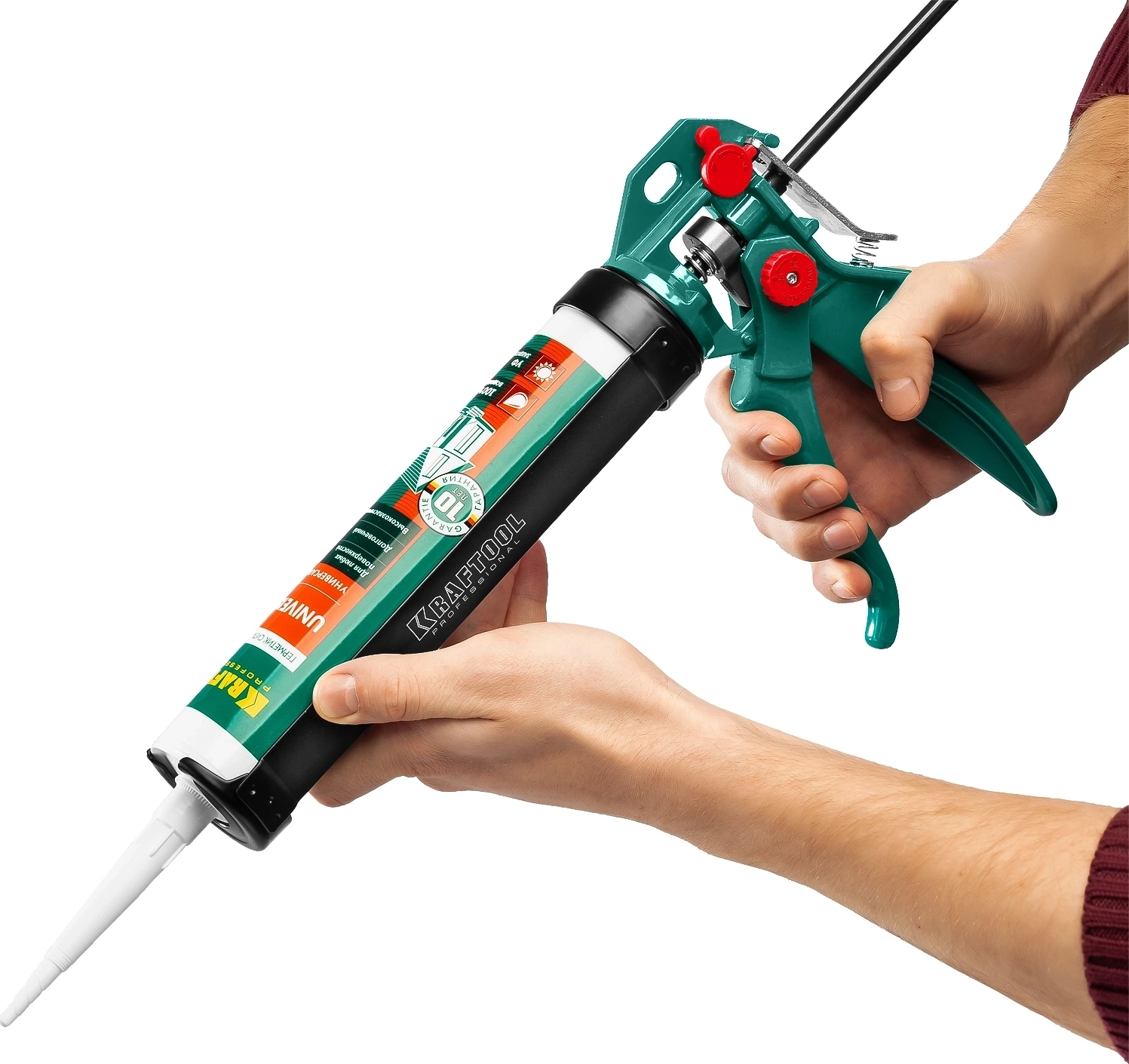Пистолет для герметиков подходит для работы с картриджами объемом 310 мл, имеет усиленную скелетную конструкцию из стали, ручку из алюминиевого сплава, которые способствуют равномерной подачи клея либо герметика. Данная спецификация обеспечивает прочность и надежность конструкции пистолета при использовании.