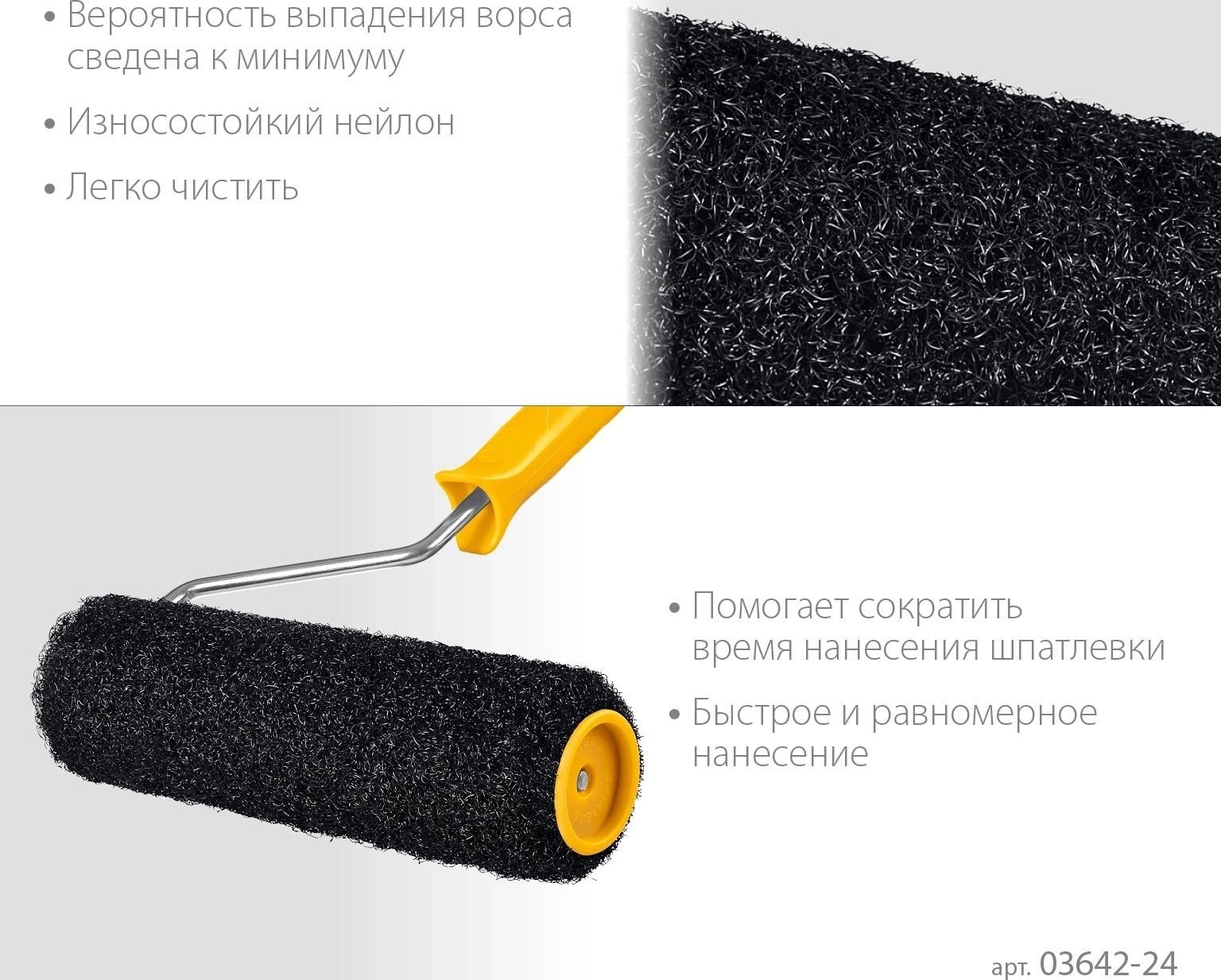 Валик для нанесения шпатлевки STAYER обладает упругим ворсом для качественного нанесения облицовочных материалов на поверхности