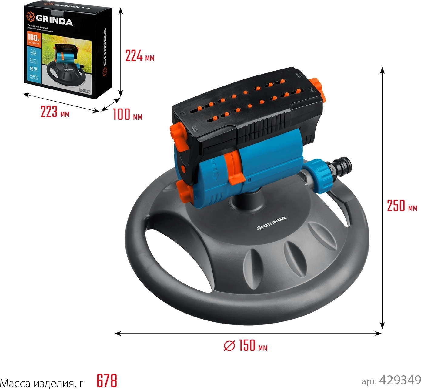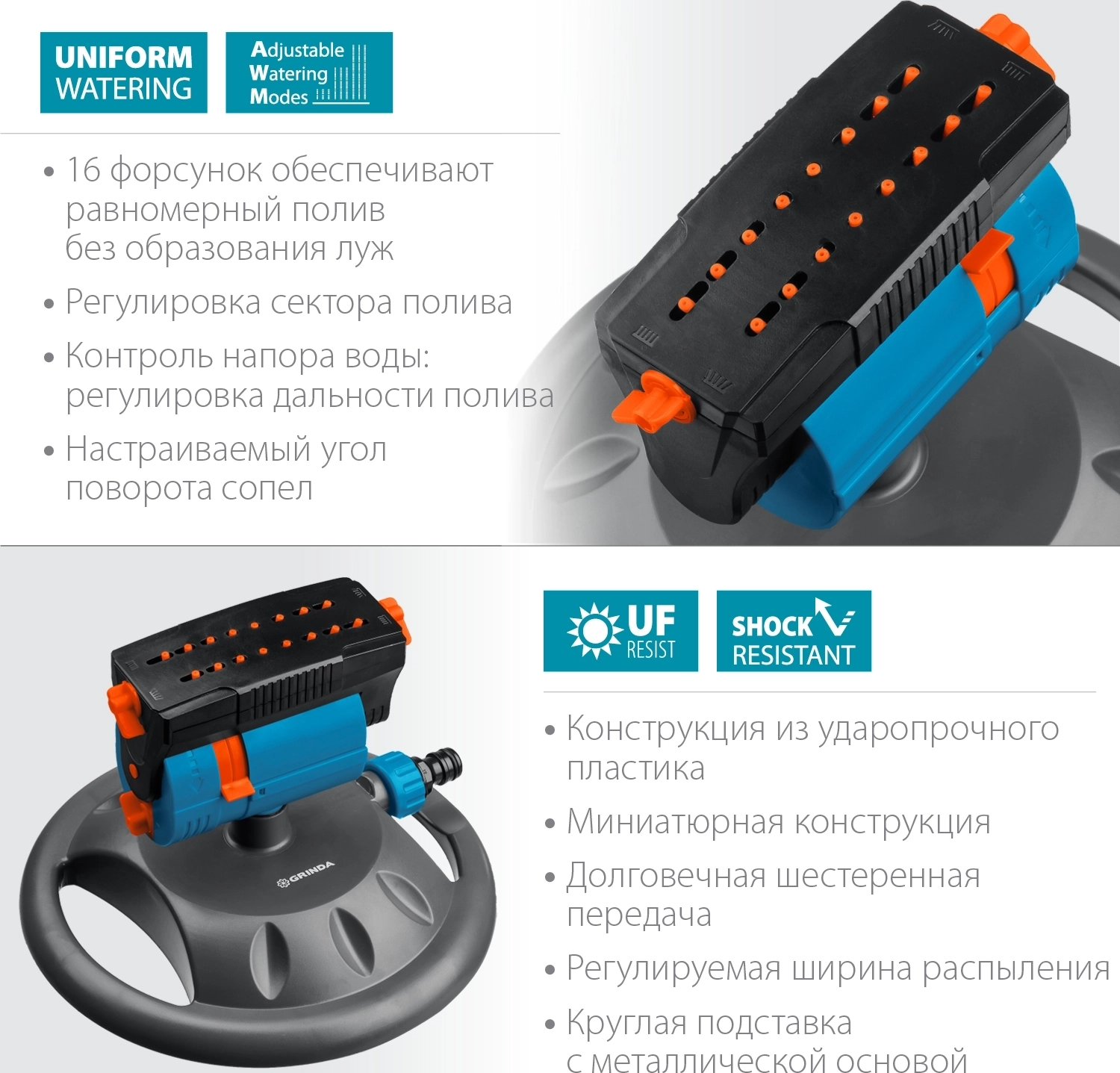 - 16 форсунок обеспечивают равномерный, настраиваемый полив без образования луж. Миниатюрный размер идеален для небольших площадей. Долговечная шестерённая передача обеспечивает плавный и надёжный ход механизма. Настраиваемая ширина распыления позволит обеспечивает гибкое изменение площади полива. Контроль напора воды позволяет регулировать дальность полива. Круглая подставка с металлической основой