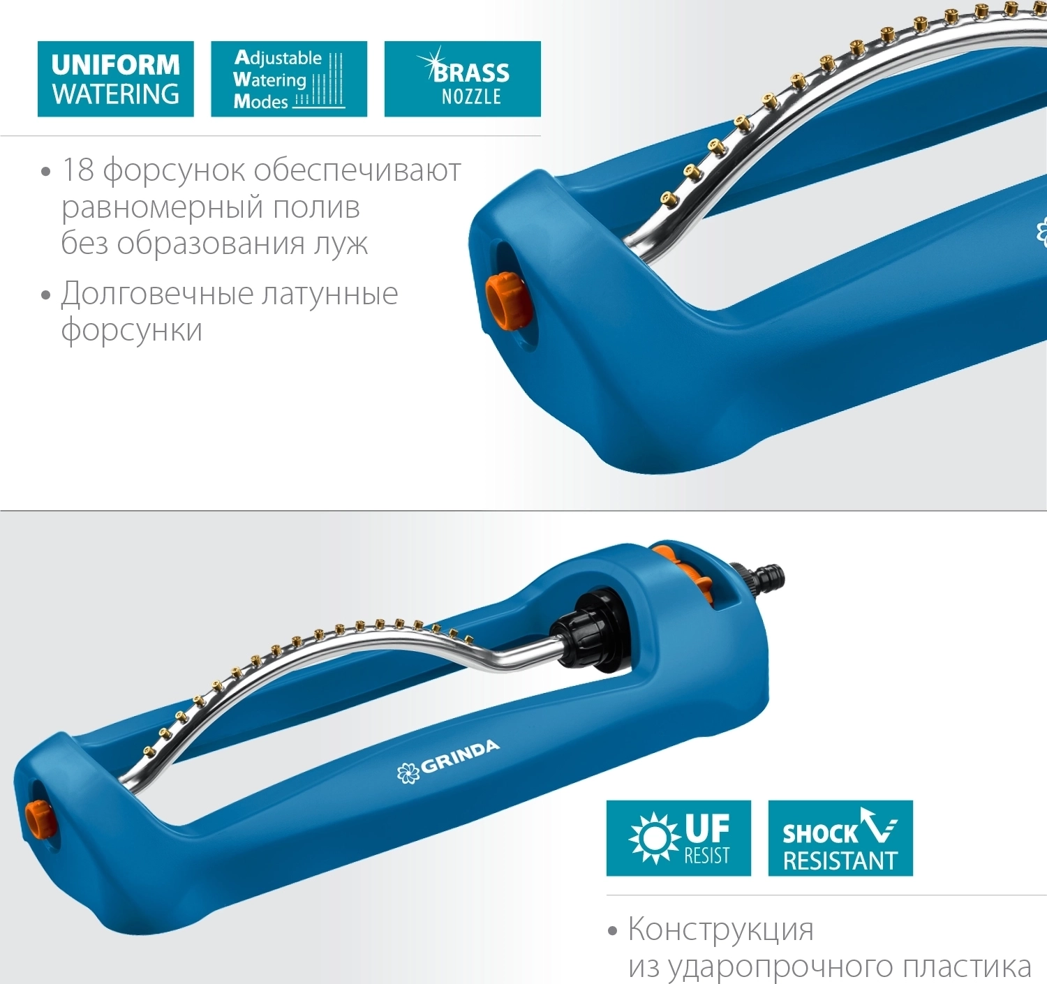 - -18 латунных форсунок обеспечивают равномерный, настраиваемый полив без образования луж.,