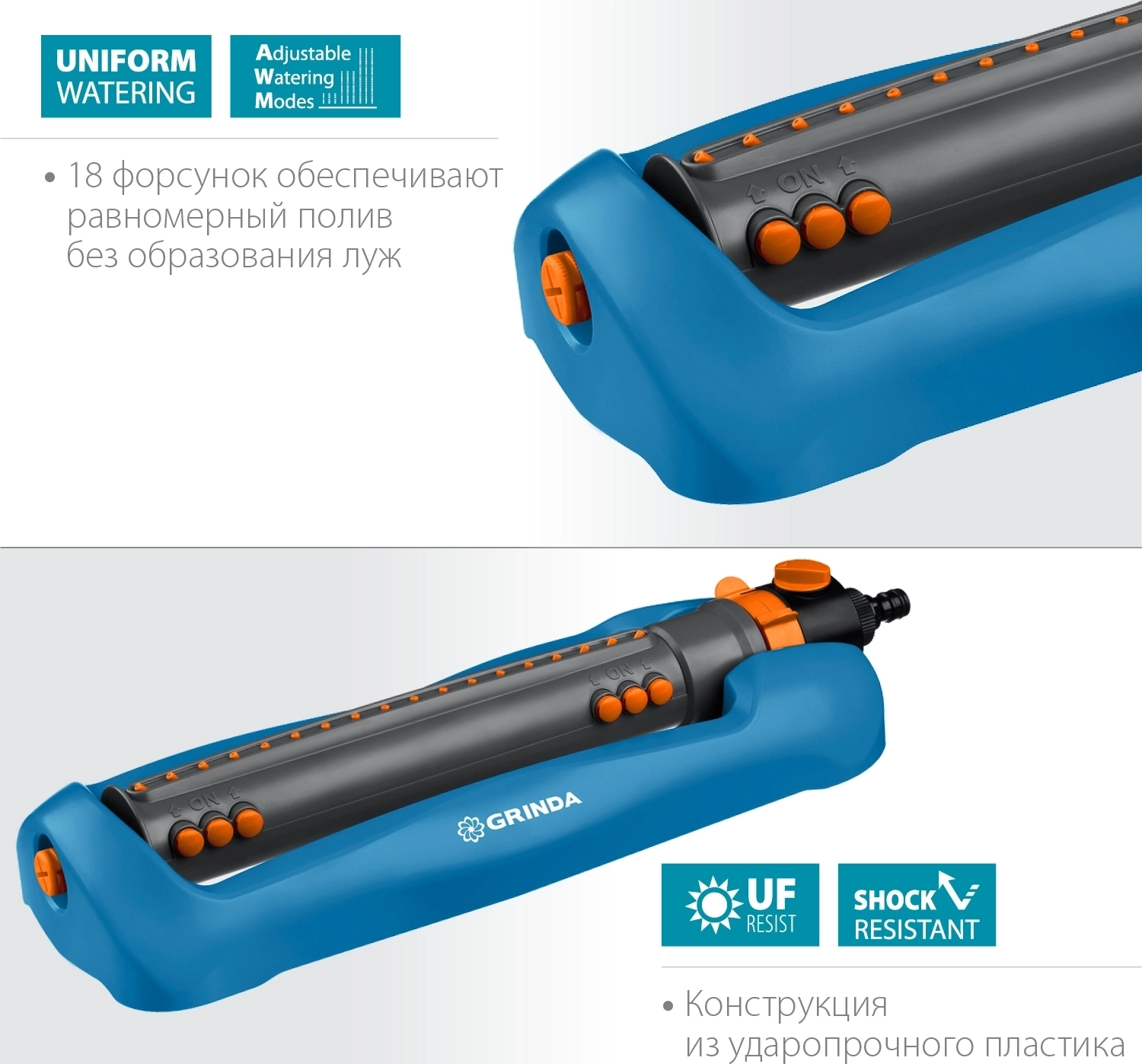 - -18 форсунок обеспечивают равномерный, настраиваемый полив без образования луж.,