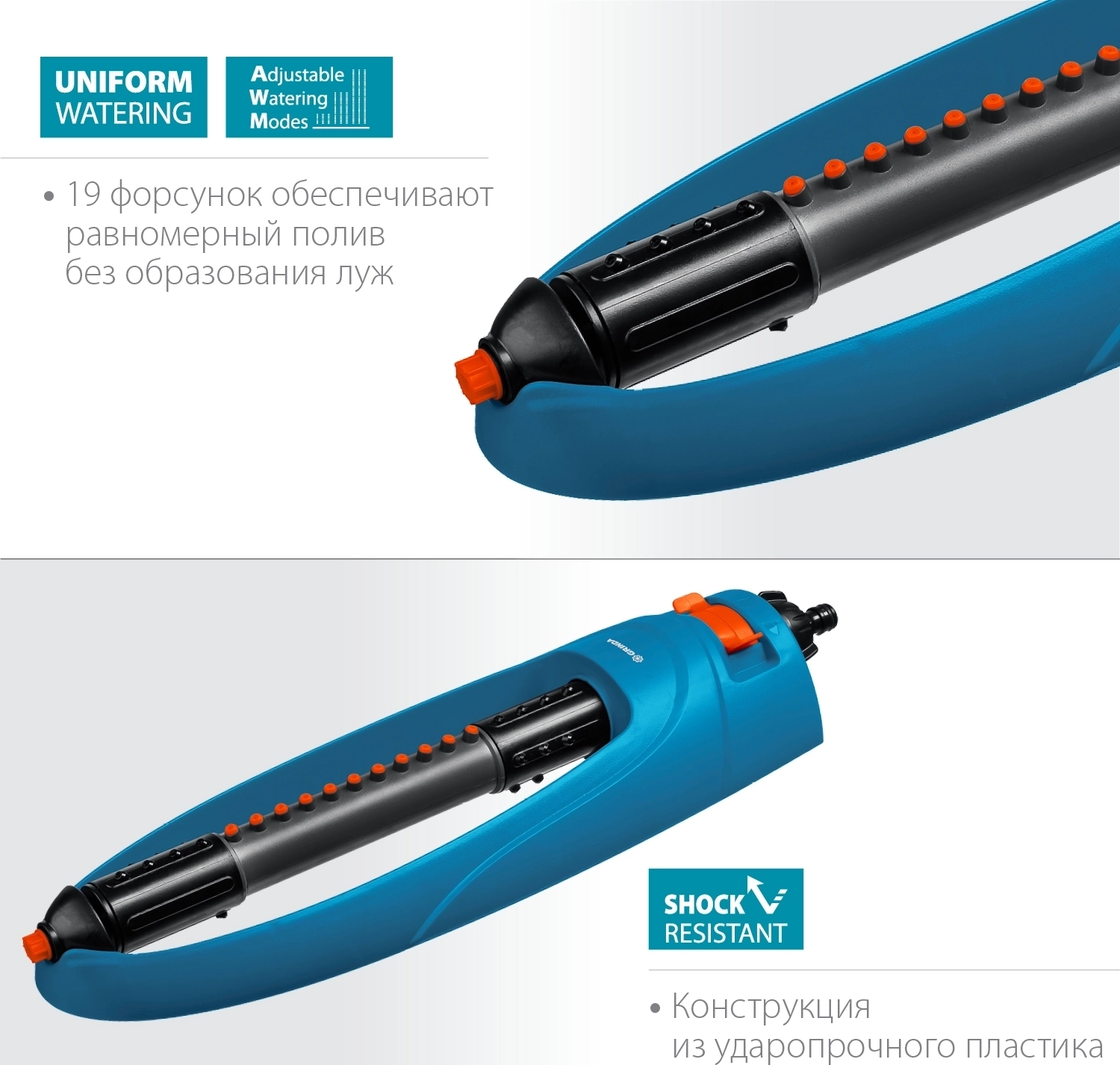 - 19 форсунок обеспечивают равномерный, настраиваемый полив без образования луж. Настраиваемая ширина распыления позволит обеспечивает гибкое изменение площади полива. Конструкция из ударопрочного пластика гарантирует прочность и долговечность изделия.