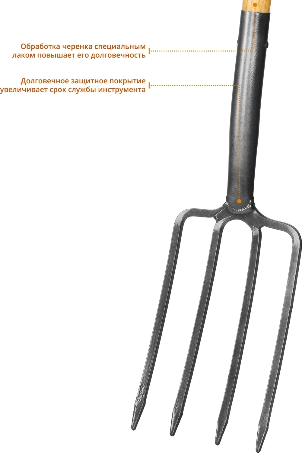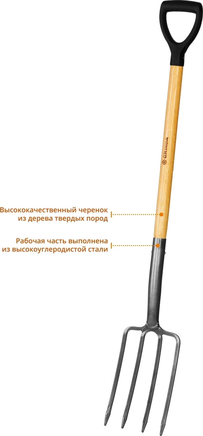 Вилы GRINDA применяются на садово-огородных участках, в сельском хозяйстве, в строительстве. Этот долговечный и функциональный инструмент изготовлен из материалов высшего качества и имеет продолжительный срок службы. Рабочая часть состоит из 4 заострённых зубцов из углеродистой стали с защитным покрытием. Прочный черенок из твёрдой древесины покрыт лаком. Для более удобного хвата на черенке имеется широкая пластиковая рукоятка. В комплект поставки входит чехол из ПВХ, обеспечивающий защиту рабочей части при хранении и транспортировке.