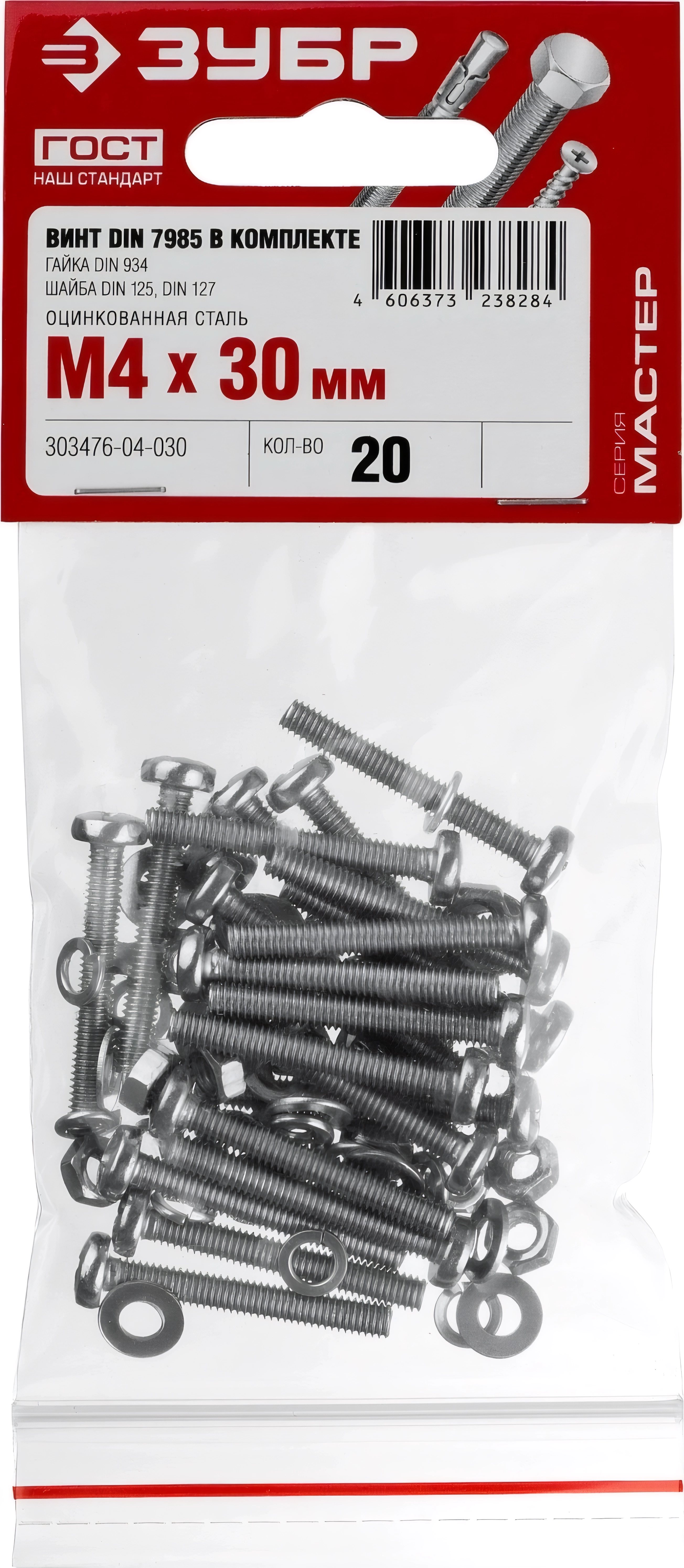 Винт с гайкой и шайбами ЗУБР DIN 7985, M4 х 30 мм, цинк, 20 шт