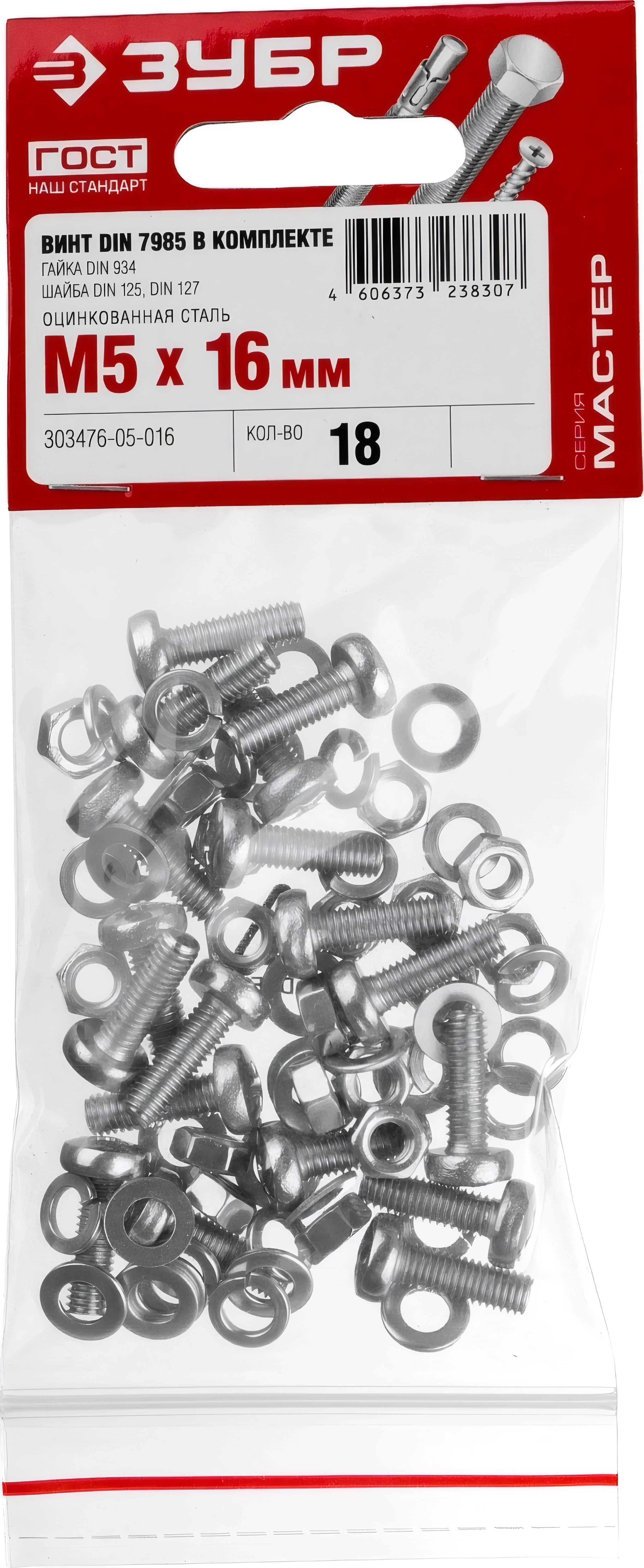 Винт с гайкой и шайбами ЗУБР DIN 7985, M5 х 16 мм, цинк, 18 шт