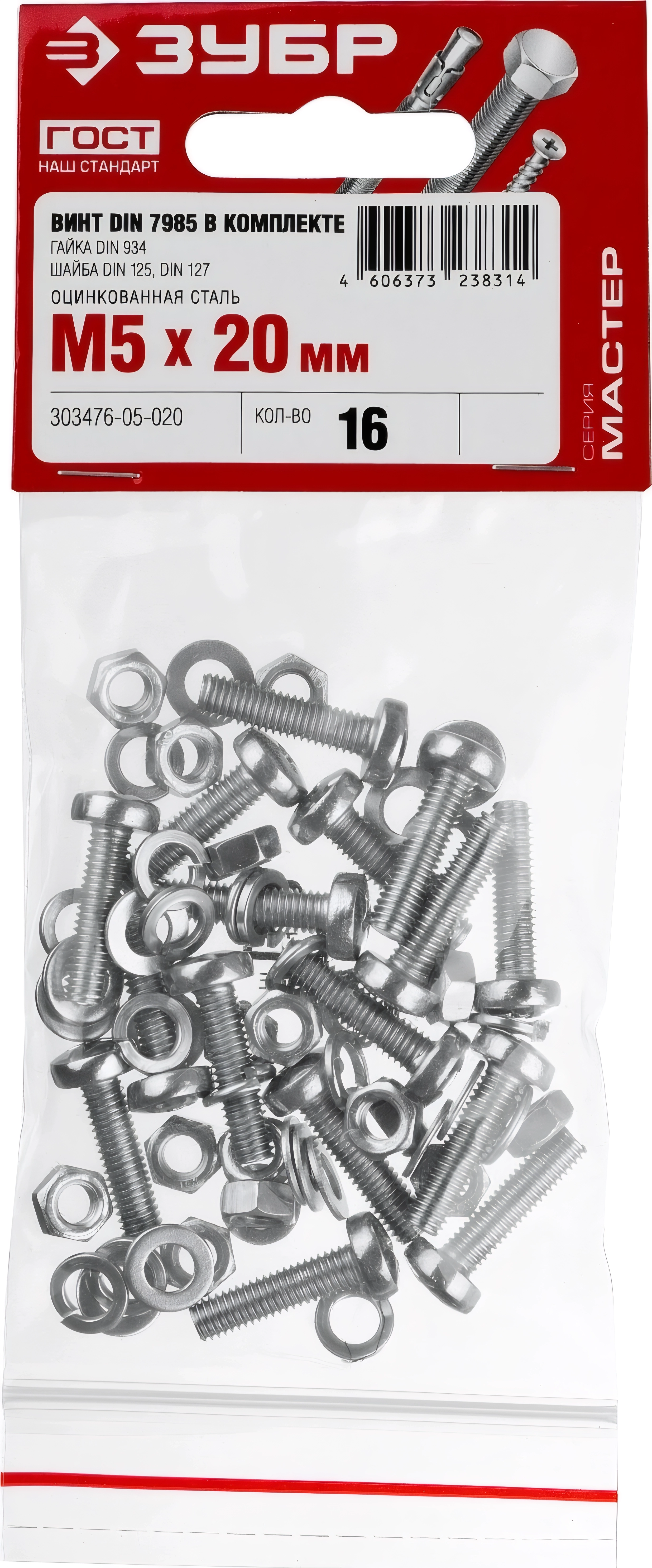 Винт с гайкой и шайбами ЗУБР DIN 7985, M5 х 20 мм, цинк, 16 шт