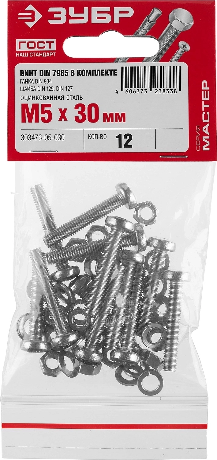 Винт с гайкой и шайбами ЗУБР DIN 7985, M5 х 30 мм, цинк, 12 шт