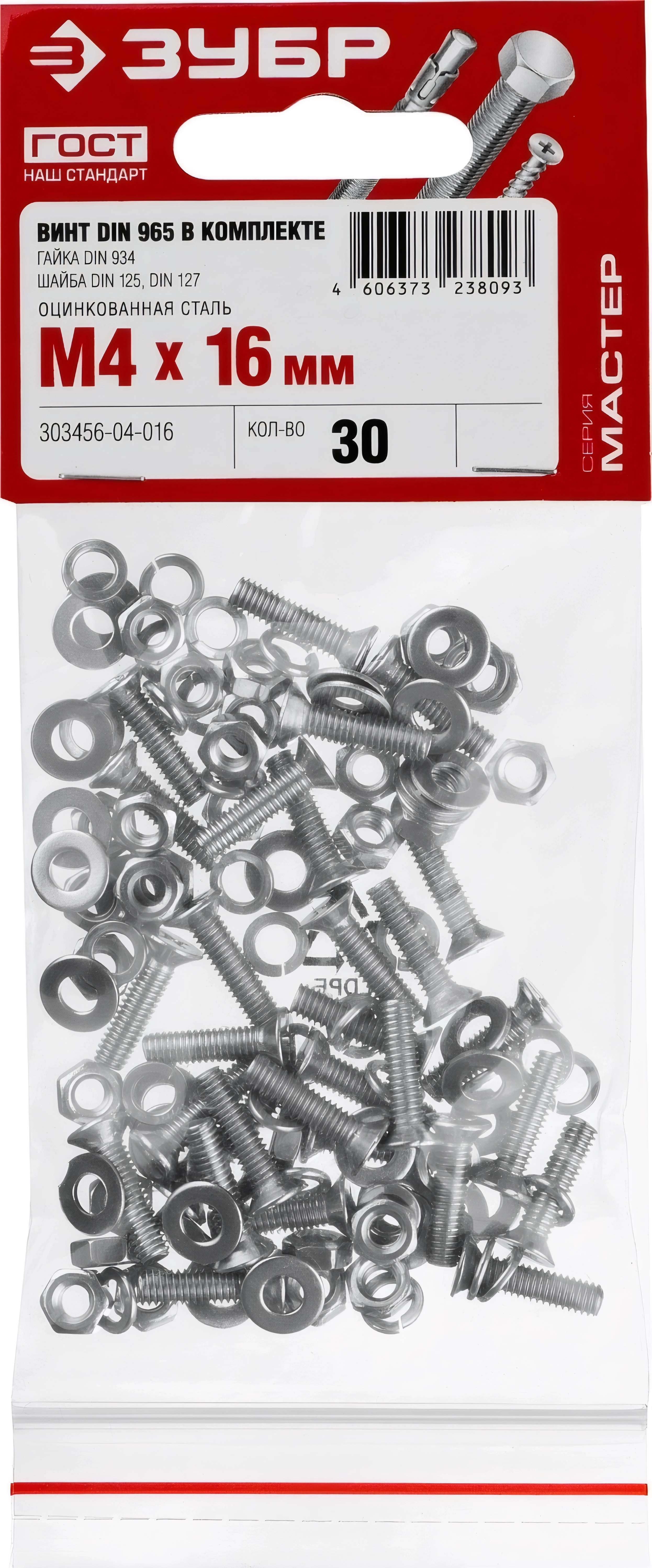Винт с гайкой и шайбами ЗУБР DIN 965, M4 х 16 мм, цинк, 30 шт