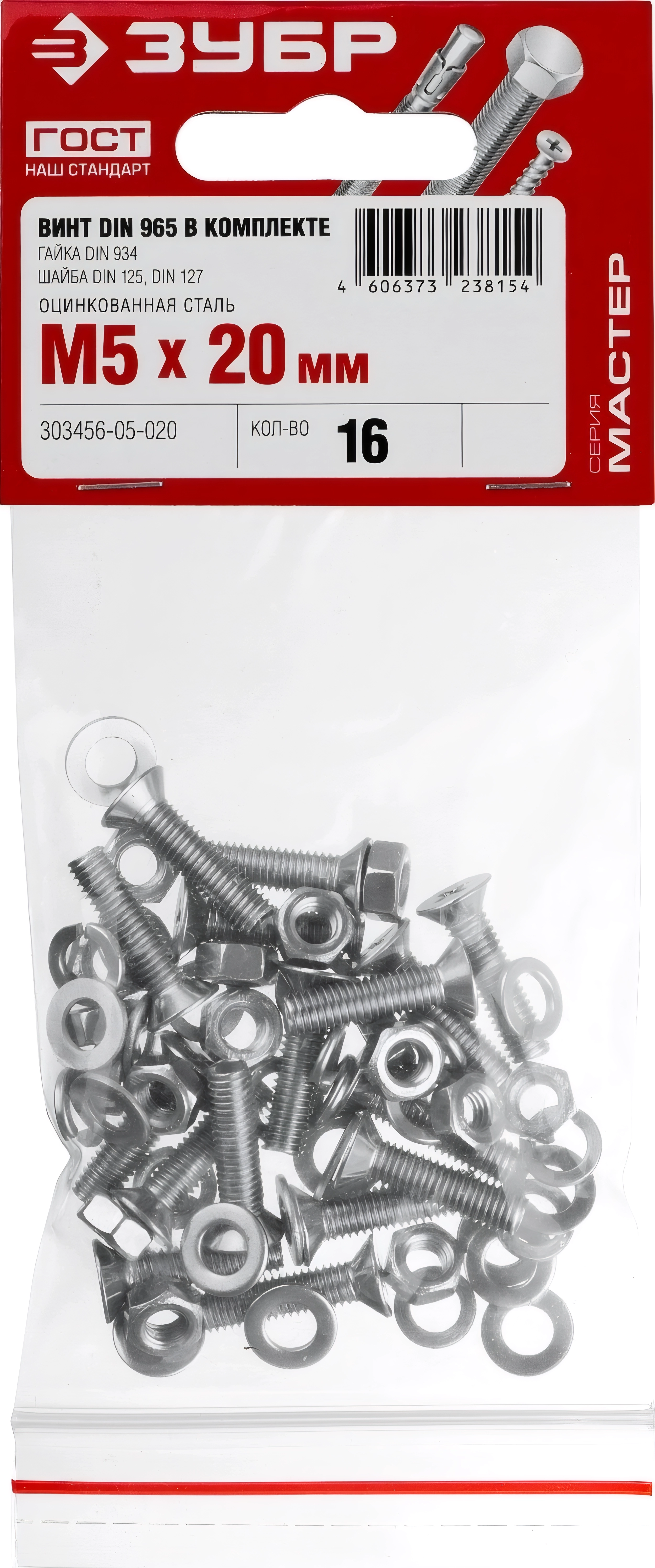 Винт с гайкой и шайбами ЗУБР DIN 965, M5 х 20 мм, цинк, 16 шт